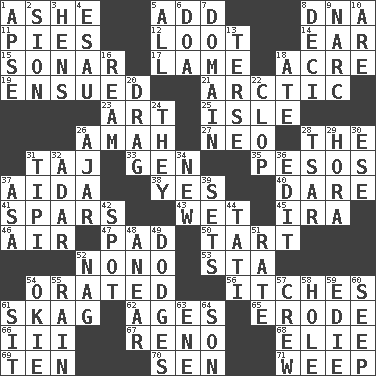 ACROSS 1. American tennis player Robert 5. Increase 8. Heredity factor (abbr.) 11. Sliced desserts 12. Spoils 14. Ewer handle 15. Echolocation 17. Unable to walk 18. 1/640 square mile 19. Followed as a consequence or result 21. Northern region 23. Nonscientific branch of learning 25. Capri or Wight 26. Nanny 27. Modern: prefix 28. Definite Article 31. _ Mahal 33. Commissioned mil. rank 35. Mexican monetary units 37. Opera by Verdi 38. Consenting reply 40. Have the gumption 41. Practice fights 43. Dripping 45. Retirement account (abbr.) 46. Atmosphere 47. Groovy apt. 50. Small pie 52. Words to Nanette 53. R.R. building 54. Spoke pompously 56. Irritating cutaneous sensations 61. Heroin 62. Eons 65. Wear away 66. One more than two 67. Former U.S. Attorney General Janet 68. Writer Wiesel 69. "___ Little Indians" 70. Elected rep. 71. Shed a tear DOWN 1. Domed church section 2. The Jewish people; Israel 3. Coop moms 4. Son of Isaac 5. Everything 6. ___ good deed 7. Realm 8. Tenth: prefix 9. Drug cop 10. "We ___ not amused" (Victoria) 13. Laconic 16. 480, 500 or 516 sheets of paper 18. Had dinner 20. To draw with force 22. Hoof sound 24. Those people 26. Partly open 28. Russian ruler of old 29. Israeli folk dance 30. Compass dir. 31. Native american tent (variation) 32. The sixth month of the Jewish calendar 34. ___ Haven, CT 36. Prepare for publication 37. White ___ sheet 39. Puts into a specified state 42. Specific locale 44. Jacques of French films 48. Approach 49. Evades 51. Pace 52. Tired old horse 54. Migrant worker of the '30s 55. Precipitation 57. Ship's personnel 58. Hollow 59. Singer Brickell 60. Ooze 61. Be seated 63. Compass dir. 64. Male offspring