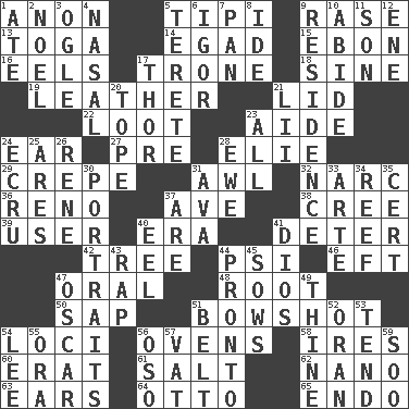 ACROSS 1. At once, immediately (arch.) 5. Native american tent (variation) 9. To erase 13. Ancient Roman robe 14. Mild oath 15. Inky black, to poets 16. Snakelike fish 17. Heavy duty weighing machine 18. Trig term 19. Cordwainer's material 21. Hat (slang) 22. Spoils 23. Helper 24. Hearing organ 27. Before (prefix) 28. Writer Wiesel 29. Streamer paper 31. Leather borer 32. Drug cop 36. Former U.S. Attorney General Janet 37. "___ Maria" 38. Algonquian 39. One who makes use of a thing 40. Period 41. Prevent from occurring 42. Relationship diagram 44. Air pressure measure (abbr.) 46. Newt 47. Relating to the mouth 48. Carrot, for example 50. Plant excrement 51. The distance a bow sends an arrow 54. Venues 56. Baking chambers 58. Angers 60. Part of Q.E.F. 61. Table seasoning 62. Billionth: prefix 63. Hearing organs 64. "Beetle Bailey" pooch 65. Inside; within (prefix) DOWN 1. Had dinner 2. Christmas carol 3. Stare at amorously 4. Rhinal 5. Cigar-shaped 6. Russian composer Stravinsky 7. Baking dish 8. Binary compound 9. Home 10. Stay 11. Boy, to dad 12. Compass dir. 17. Son of Odin 20. Drink excessively 21. Cards in a Roman deck? 23. Everything 24. Shade of tan 25. Ancient Greek god of war 26. French philosopher Descartes 28. She-sheep 30. Likenesses of persons 31. Actress Gardner 33. Johnson of "Laugh-In" 34. Coral ridge 35. Foregone conclusion 37. "We ___ not amused" (Victoria) 40. Snakelike fish 41. "Vaya con ____" 43. Reproach for some lapse or misdeed 44. Right away 45. Sty mamas 47. Witty Wilde 49. One or ones belonging to thee 51. Waist strap 52. Northwest Algerian city 53. Look after 54. Area sheltered from the wind 55. Mouth or opening 56. Bear (Spanish) 57. Large container 59. "Barney Miller" actor Jack