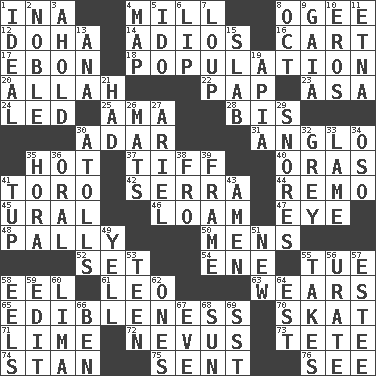 ACROSS 1. _ tizzy (2 wds.) 4. Place where flour is made 8. Double curve, resembling the letter S 12. Capital of the state of Qatar 14. Goodbye (Sp.) 16. Draw slowly or heavily 17. Inky black, to poets 18. Census information 20. Assad's deity 22. Infant food 23. White ___ sheet 24. Directed 25. Nursemaid (var.) 28. Again 30. The sixth month of the Jewish calendar 31. White American of non-Hispanic descent 35. Being at a high temperature 37. Small quarrel 40. Mouths or openings 41. "Corrida" creature 42. Father Junipero _ 44. San ____ (Riviera town) 45. Mountain range 46. Rich soil 47. Sight organ 48. Chummy 50. Not women's 52. Arrange properly for use 54. Compass dir. 55. Third day of the wk. 58. Snakelike fish 61. Lion 63. Puts on (as clothing) 65. The property of being fit to eat 70. Three-handed card game 71. Welles in "The Third Man" 72. Congenital growth or mark on the skin 73. False hair 74. Comedian Laurel of Laurel & Hardy 75. Transmitted 76. Perceive with the eye DOWN 1. Standard of perfection 2. Impressive in appearance 3. Hold, grip (Informal) 4. Atlas unit 5. Wedding promise 6. Mouth edge 7. Central Nebraska county 8. Sep. follower 9. Greek goddess of the earth (variant) 10. Greek god of love 11. Inactive volcano in Sicily 13. Santa ___, CA 15. Thick slice 19. Capital of Western Samoa 21. Possessed 26. Floor protectors 27. Satellite of Uranus 29. Sounds asleep 30. Ringlike coral islands and reefs 32. Jennifer or Joel 33. Unable to walk 34. Bear (Spanish) 35. Israeli folk dance 36. Relating to the mouth 38. Away 39. Movie unit 41. Uncastrated adult male sheep 43. So be it 49. Shout 51. ___ Haven, CT 53. Adolescent 55. Proceeds 56. A salt of uric acid 57. First name in cosmetics 58. Snakelike fish 59. Prepare for publication 60. Pale green bean 62. Singles 64. Eastern Standard Time (abbr.) 66. Benjamin's nick name 67. Night before a holiday 68. Player for Phoenix 69. Fast jet (abbr.)