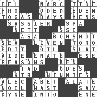 ACROSS 1. Snakelike fish 4. Drug cop 8. Event that recurs at intervals 12. Back 13. Wrote a lyric poem 14. Paradise 15. Ancient Roman robes 18. 24-hour periods 19. Not women's 20. More lively and spirited 22. Health resort 23. Remaining after all deductions 24. Compass dir. 25. White ___ sheet 26. The distance a bow sends an arrow 30. Ocean 33. Make or become more lively 36. "Corrida" creature 37. Prepare for publication 39. Petroleum 40. Narrow board 41. Helper 42. Maternal 44. Compass dir. 45. Thinks logically 47. Benjamin's nick name 50. Bit 51. Lyric poems 53. Apertif with cassis 54. Fools 57. Actor Baldwin 59. Collude with 61. Having winglike extensions 63. Christmas carol 64. Political cartoonist Thomas 65. Declare 66. Unit of force 67. To the inside or interior of 68. Compass dir. DOWN 1. Newt 2. Greek god of love 3. Utah city north of Ogden 4. Connecting point 5. The sixth month of the Jewish calendar 6. Marina Del _, California 7. Music discs 8. Storms 9. It may be bright or harebrained 10. Lair 11. Followers of ems 16. At sea 17. Fast planes 21. Slanted text style (abbr.) 22. Compass dir. 24. Male child 26. Waist strap 27. Hollow 28. Mouths or openings 29. Haul 30. Shrivel 31. Singer Brickell 32. Opera by Verdi 34. Charged atoms 35. By way of 38. One of the two male reproductive glands 42. Conclusion 43. Inky black, to poets 46. Rowing implement 48. Pulitzer Prize-winning author Ferber 49. Famous astronaut Armstrong 52. Gospel singer Marvin 53. Peachy ____! 54. Egg locale 55. "Tell ____ the Marines!" 56. Comedian Laurel of Laurel & Hardy 57. Plus 58. Myrna of the movies 59. Black tropical American cuckoo 60. Forbid 62. Sight organ