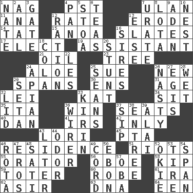 ACROSS 1. Tired old horse 4. Pacific Standard Time (abbr.) 7. Uhlan (variant) 11. Santa ___, CA 12. Pace 13. Wear away 14. Make lace 15. Small Philippine buffalo 16. Chalkboards 17. Choose 19. Aide 21. Petroleum 23. Family _ (genealogy) 24. _ vera 25. Take to court 26. ___ Haven, CT 29. Connects, as a bridge 30. Followers of ems 31. Ripen 32. Luau accessory 33. Krazy ___ of comics 34. Be seated 35. Call ___ day 36. Victory 37. Theater features 40. One of the 12 tribes of Israel 41. Big collection agency 42. In an inward manner 43. Australian parrot (variant) 45. Parent Teacher Assoc. 46. Dwelling 51. Disturbances 55. Speaker 56. Mitch Miller's instrument 58. Monetary unit of Laos 59. Carrier 60. Loose flowing garment 61. Lyricist Gershwin 62. SW Saudi Arabia district 63. Heredity factor (abbr.) 64. Car or cant ending DOWN 1. Nathan's nickname 2. Of or related to the anus 3. Yard entry 4. Baking dish 5. Portico 6. Afternoon social gatherings 7. A salt of uric acid 8. Globular water bottle used in Asia 9. An important port of Yemen 10. A home for chicks 12. Food allowance for one day 13. Otherwise 16. Male parents of animals 18. Root beer relative 20. Check the growth or development of 22. French article 24. Bee-related 25. Actors Connery and Penn 26. Characterized by obscenity 27. Armor plate that protects the chest 28. Soggy 29. Stalk of a moss capsule 32. Hat (slang) 33. Japanese brewing company 36. One who wires 37. Small drink 38. Main course 39. Mountain range southwest of Kyrgyzstan 43. 61 cubic inches 44. Scent 46. Round or rotation of duties 47. Greek god of love 48. Suttee (variant) 49. Drawstring 50. Inky black, to poets 52. Migrant worker of the '30s 53. Hoop that covers a wheel 54. Connect, as a bridge 57. Chief or king in Benin or Nigeria
