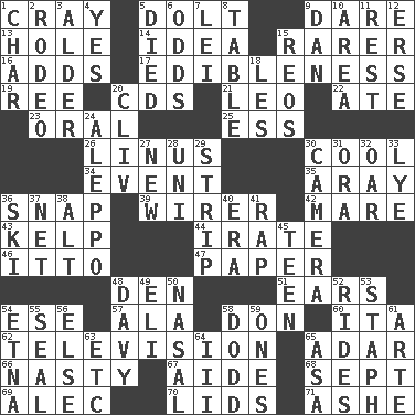 ACROSS 1. Supercomputer manufacturer 5. Stupid person 9. Have the gumption 13. Opening into or through something 14. It may be bright or harebrained 15. More uncommon 16. Sums up 17. The property of being fit to eat 19. To separate or throw off 20. Music discs 21. Lion 22. Had dinner 23. Taken by mouth 25. Double-curved letter 26. "_ and Lucy" (Charlie Brown theme song) 30. Calm and collected 34. Incident 35. Like ___ of sunshine 36. Fastener 39. One who wires 42. Female horse 43. Seaweed 44. Feeling or showing extreme anger 46. "Tell ____ the Marines!" 47. Some stationery 48. Lair 51. Hearing organs 54. Compass dir. 57. In the manner of 58. Spanish title 60. Call ___ day 62. Boob tube 65. The sixth month of the Jewish calendar 66. Characterized by obscenity 67. Helper 68. Back-to-school mo. 69. Actor Baldwin 70. Flaplike coverings 71. American tennis player Robert DOWN 1. Burn to charcoal 2. Cowboy competition 3. Tree or shrub in the Birch family 4. It is so 5. Passed on 6. Likelihood 7. Luau accessory 8. Eating place 9. Daniel's nick name 10. Length times width 11. Respite 12. Celtic language 15. Vintage cars 18. French article 20. 154 in Roman numerals 24. City in Syria 27. ___ Haven, CT 28. Single; one (prefix) 29. Long narrow piece of something 30. Device for capturing images 31. Mouth or opening 32. Rowing implement 33. Potassium hydroxide 36. What Jean-Claude Killy likes to do 37. Fish or hair follower 38. The first octave above the treble staff 40. Period 41. Hit sharply and swiftly 45. Adolescent 48. American folk hero Crockett 49. Biblical high priest 50. Rhinal 52. Amusement-park features 53. Staphylococcus 54. Inactive volcano in Sicily 55. Lick closed 56. Otherwise 58. Texas town _ City 59. Washington bills 61. Johnson of "Laugh-In" 63. And so on (abbr.) 64. One more than two 65. White ___ sheet