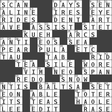 ACROSS 1. Skim 5. 24-hour periods 9. Elected rep. 12. Place in a line 14. Angers 15. Sight organ 16. Amusement-park features 17. Incision 18. Nonscientific branch of learning 19. "___ Maria" 20. Help 23. Proofreading order 24. Malaysian steamed pastry 25. Arches 27. Against 30. Greek goddess of the dawn 32. Ocean 33. Lightbulb-shaped fruit 34. Monetary unit of Botswana 36. And so on (abbr.) 38. The 19th letter of the Greek alphabet 39. Keyboard key 40. To free from 43. Afternoon social gathering 46. Filth; sediment 48. Had on 49. Zeal 51. Modern: prefix 52. Connect, as a bridge 53. Make new 54. Overwhelm 56. Nuclear Threat Initiatives 58. Greek mezzo-soprano Agnes 61. Put into a specified state 64. A really long time 65. Competent 66. Carrier 68. It is 69. Beverages made from leaves 70. White Person, in Hawaii 71. Area sheltered from the wind 72. Prepare for publication 73. Raze (variant) DOWN 1. "Two Mules for Sister ____" 2. 154 in Roman numerals 3. Helper 4. Compass dir. 5. "You Light Up My Life" star Conn 6. Ancient Greek god of war 7. Gossips 8. Fast jet (abbr.) 9. Theater features 10. Jane of fiction 11. Remaining after all deductions 13. Son of Isaac 21. Ooze 22. Yells 23. Get outta here! 24. Apertif with cassis 26. To separate or throw off 27. Fitting 28. Teachers' org. 29. Pulled tight 31. Killed 35. Most capable 37. Riding implement 41. Retirement account (abbr.) 42. Lair 44. Nights before holidays 45. Assist 47. Immeasurably long periods of time 48. Compass dir. 50. Crowded into 53. Remove soap 55. Pledge 56. Famous astronaut Armstrong 57. Haul 59. Mountain range southwest of Kyrgyzstan 60. For fear that 61. Portico 62. Snakelike fish 63. Relationship diagram 65. Had dinner 67. Boat paddle
