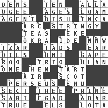 ACROSS 1. Lairs 5. "___ Little Indians" 8. Silent film actress Nazimova 12. Double curve, resembling the letter S 13. Eras 15. Rich soil 16. Rep 18. Food container 19. South American Indian 20. Curve 22. Slender, wiry 24. Beverages made from leaves 26. Make supply last 27. Gumbo ingredient 28. Binary compound 29. Compass dir. 32. Russian ruler 35. Small amounts or degrees 37. Ewer handle 38. Petroleums 39. University (slang) 40. Yawn 41. Friend of Pooh 42. Musical group of three 43. ____ Bator 44. Single 45. Layer 46. Small pie 49. Atmosphere 50. Highlander 51. Son of Zeus who helped slay Medusa 55. Australian flightless bird 56. Religious group 57. Relationship diagram 59. A-one 63. Indian skirt 64. Mild oath 65. The sixth month of the Jewish calendar 66. Loyal 67. Raised railways 68. Globular water bottle used in Asia DOWN 1. ___ good deed 2. Ovum 3. Born 4. Elected representatives 5. Bit 6. The front part of a cuirass 7. Egg locale 8. Place in a line 9. Yearn 10. Made of lace 11. Nanny (var.) 14. Fragments 17. Long journey 21. Automobile 23. Eisenhower's nickname 25. Titan orbits this 28. Foolish or stupid persons 29. Anneal 30. California wine valley 31. Songbird 32. "Corrida" creature 33. The Jewish people; Israel 34. Medicinal plant 36. Black tropical American cuckoo 40. From the throat 42. Cigar-shaped 45. Part of HMS, perhaps 47. Adept person 48. Play 49. Nick name for Arthur 51. Lightbulb-shaped fruit 52. Shade of tan 53. Goad 54. Lick closed 56. Fast jet (abbr.) 58. Begley and Asner 60. Wedding promise 61. Floor covering 62. Epoch