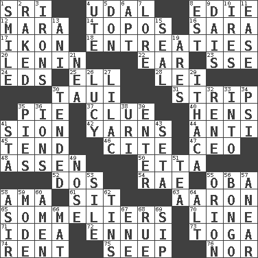 ACROSS 1. _ Lanka 4. Allodial 8. Singer Brickell 12. Hindu Mythology: god of death 14. Traditional theme or motif 16. "Two Mules for Sister ____" 17. Image 18. Pleas 20. Soviet premier 1918-24 22. Ewer handle 23. Compass dir. 24. Begley and Asner 25. Pipe bend 28. Flowery wreath 30. "Change" in Tahitian 31. Long narrow piece of something 35. Sliced dessert 37. A slight indication 40. Coop moms 41. The Jewish people; Israel 42. Tall tales 44. Opposed to 45. Watch over 46. Quote 47. Corporate head (abbr.) 48. NE Netherlands city 50. Singer James 52. Two (Sp.) 54. Actress Charlotte 55. Chief or king in Benin or Nigeria 58. Housemaid (var.) 61. Be seated 63. Composer Copland 65. Wine waiters 70. Actor's bit 71. The content of cognition 72. World-weariness 73. Ancient Roman robe 74. Monthly bill 75. Ooze 76. Not either DOWN 1. Grin 2. Moved through 3. Metal shackles 4. Shoshoni 5. Spanish title 6. Fitting 7. Old wives' tales, e.g. 8. Eastern Standard Time (abbr.) 9. Raised platform 10. Angers 11. Comfort 13. Black tropical American cuckoo 15. Lick closed 19. Ancient Greek god of war 21. Teachers' org. 26. "I Love _" 27. Pale purple color 29. New York city 30. Looked after 32. French philosopher Descartes 33. To the inside or interior of 34. Air pressure measure (abbr.) 35. Sliced desserts 36. Charged particles 38. RI univ. 39. Keyboard key 41. R.R. building 43. Stalk of a moss capsule 49. Sense of smell 51. Beverage made from leaves 53. Drop; flow; fall 55. Greek mythologigal hunter 56. Beat drum 57. Approach 58. SW Saudi Arabia district 59. Method 60. So be it 62. Airtight sealed metal containers 64. Keyboard modifier key 66. Floor covering 67. Compass dir. 68. Sorrow 69. Small drink