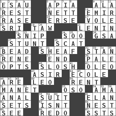ACROSS 1. Son of Isaac 5. Capital of Western Samoa 9. Wing 12. Remainder 13. Remaining after all deductions 14. Arab leader 15. Raze (variant) 16. Celtic language 17. Grand slam 18. _ Lanka 19. The 23rd letter of the Hebrew alphabet 21. Soviet premier 1918-24 22. Sever or remove by pinching or nipping 24. "Barney Miller" actor Jack 26. Girls' org. (abbr.) 27. Check the growth or development of 28. Jazz singing style 29. Necklace unit 30. To gather and bind into a bundle 32. Comedian Laurel of Laurel & Hardy 36. French philosopher Descartes 37. Conclude 38. Diluted with white 39. Chooses 40. Make a splashing sound 42. Butter sub 43. SW Saudi Arabia district 44. Learning spot: Fr. 46. "We ___ not amused" (Victoria) 49. Lion 50. Monthly bill 51. French painter Edouard 53. Bear (Spanish) 54. Nursemaid (var.) 57. Of or related to the anus 58. Set of matching outer garments 61. Style 62. Arranges properly for use 63. Is not 64. Egg locale 65. Perceive with the eye 66. Make new 67. Fast planes DOWN 1. Blunders 2. Wither 3. Helper 4. Shoshoni 5. Afresh 6. For each 7. It is 8. Had dinner 9. Amid 10. Ms. Damita and namesakes 11. Sports stadium 14. Night before a holiday 19. Shallow baking pan 20. Tenement units (abbr.) 21. Car dealer's back yard 23. Unadorned figures 24. Heaps 25. Clumsy lout 27. Ooze 28. Sir (Sp.) 29. Sis' sibling 31. Sun: prefix 32. Soup utensil 33. Baron Munchausen's specialties 34. Toward shelter 35. Modern: prefix 40. Compass dir. 41. Possessive pronoun 43. The first octave above the treble staff 45. Corporate head (abbr.) 46. Collect or gather 47. The wife of a rajah (variant) 48. Related on the mother's side 52. Raised railways 53. Von Bismarck 55. Vertical spar for supporting sails 56. Pismires 58. Title for a knight 59. Purpose 60. Working for oneself (abbr.) 61. Followers of ems