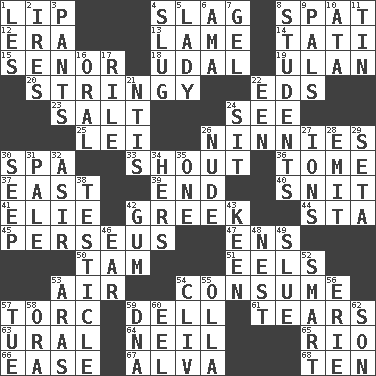 ACROSS 1. Mouth edge 4. Volcanic refuse 8. Petty quarrel 12. Period 13. Unable to walk 14. Jacques of French films 15. Sir (Sp.) 18. Allodial 19. ____ Bator 20. Slender, wiry 22. Begley and Asner 23. Table seasoning 24. Observe 25. Flowery wreath 26. Fools 30. Health resort 33. Yell 36. Heavy book 37. 90 degrees 39. Conclusion 40. In a ____ (agitated or irritated) 41. Writer Wiesel 42. Hellenic 44. R.R. building 45. Son of Zeus who helped slay Medusa 47. Followers of ems 50. Scottish cap 51. Snakelike fish 53. Wind 54. Ingest 57. Torque (variant) 59. Small valley 61. Pulls apart 63. Mountain range 64. Famous astronaut Armstrong 65. _ de Janeiro 66. Comfort 67. Inventor's middle name 68. Nine, plus one DOWN 1. French article 2. Angers 3. Leg coverings 4. Snaillike creature with no shell 5. Kenny Rogers chart-topper in '80 6. Housemaid (var.) 7. Set 8. SAT takers 9. Friends 10. "One Day ___ Time" 11. Metal container 16. Spoken 17. Cause heat under the collar 21. Nuclear Threat Initiatives 22. Car or cant ending 24. Be seated 26. Naked 27. Charged particles 28. Give off 29. Bristle 30. Ooze 31. Diluted with white 32. SW Saudi Arabia district 34. Possessive pronoun 35. Single 38. One of the two male reproductive glands 42. Chewing product 43. Peachy ____! 46. Hearing organ 48. Egg locale 49. Turn sharply 52. Don Adams' spy role 53. Ancient river in northeast Turkey 54. 154 in Roman numerals 55. Water jar 56. One of the Great Lakes 57. Third day of the wk. 58. Mouth or opening 59. Heredity factor (abbr.) 60. Snakelike fish 62. Manchild