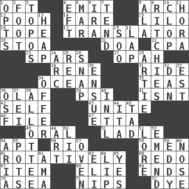 ACROSS 1. Often (poetically) 4. Send forth 8. Bowlike part 12. "Silly old bear" 14. Conductor's collection 15. _ and Stitch 16. Drink excessively 17. Interpreter 20. Portico 21. ___ good deed 22. Tax preparer (abbr.) 23. Practice fights 27. Brightly colored fish 29. French philosopher Descartes 31. Travel on or in a vehicle 34. Sea 35. Beverages made from leaves 36. Norwegian king 39. 23rd letter of the Greek alphabet 41. Is not 42. Automatic 43. Join together 46. Do some clerical work 47. Singer James 48. Spoken 51. Dipping utensil 54. Fitting 56. _ de Janeiro 58. Presage 61. Happening in regular succession 66. Do over again 67. A distinct part 68. Writer Wiesel 69. Conclusions 70. At sea 71. Cuts off 72. Color DOWN 1. Elects 2. One third of a yard 3. Literary convention 4. Newt 5. Make imperfect 6. Lyricist Gershwin 7. Be inclined (to) 8. Wing 9. Actors Guy, Robert Welles, and Clint 10. Hoof sound 11. Israeli folk dance 13. Pile 18. "Barney Miller" actor Jack 19. Infant locale 24. Curve 25. To separate or throw off 26. Fastener 28. Nick name for Arthur 30. Take place subsequently 32. One of the 12 tribes of Israel 33. Eastern Standard Time (abbr.) 34. Auction bid 36. Order of Saint Francis (abbr.) 37. Luau accessory 38. One to whom something is allotted 40. International (abbr.) 44. Call ___ day 45. Small amount or degree 49. Nonscientific branch of learning 50. Cards in a Roman deck? 52. Old wives' tales, e.g. 53. Make improvements or corrections to 54. Roberta Peters solo 55. Plant holders 57. Baking chamber 59. Whirlpool 60. Characteristic smell of wine 62. Wet nurse (var.) 63. Biblical high priest 64. Mouth edge 65. Consenting reply