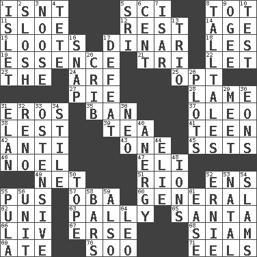 ACROSS 1. Is not 5. _-fi 8. Small child 11. A type of plum 12. State of inaction 14. Grow older 15. Plunders 17. Middle Eastern gold or silver currency 18. French article 19. Gist 21. Three (prefix) 22. Allow 23. Definite Article 24. Sandy's bark 25. Elect 27. Sliced dessert 28. Unable to walk 31. Greek god of love 35. Forbid 37. Margarine 38. For fear that 39. Afternoon social gathering 41. Adolescent 42. Opposed to 43. Single 45. Fast planes 46. Christmas carol 47. Biblical high priest 49. Fish or hair follower 51. River (Sp.) 52. Followers of ems 55. Purulenc 57. Chief or king in Benin or Nigeria 60. Commissioned military rank 62. Corn or form start 63. Friendly 65. Before Barbara or Clara 66. 54 in ancient Rome 67. Celtic language 68. Thailand, formerly 69. Had dinner 70. "Barney Miller" actor Jack 71. Snakelike fish DOWN 1. Small island 2. Make a splashing sound 3. Trap for birds or small mammals 4. False hair 5. Indian title of respect (Mr.) 6. Penny 7. Austrian river, tributary to the Danube 8. Baron Munchausen's specialties 9. Double curve, resembling the letter S 10. Trial 13. Musical group of three 16. Fastener 17. Outscore 20. Baby bed with high sides 26. Secret plans 29. Rendezvous 30. Immeasurably long periods of time 31. Style 32. Western Nevada city 33. Clearly or manifestly demonstrative 34. Vertical member of a panel or frame 36. Modern: prefix 40. Disorder of the immune system 44. Writer Wiesel 48. Charged atoms 50. Drink excessively 52. Bert's buddy 53. Brizilian seaport 54. Shuts with force 55. Monetary unit of Botswana 56. A single undivided whole 58. Long, evenly shaped pieces 59. In addition 61. Comfort 64. Lion