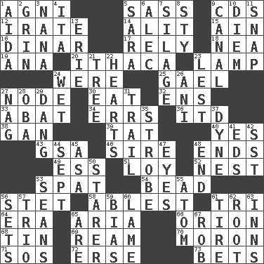 ACROSS 1. Hindu god of fire 5. Backtalk 9. Music discs 12. Feeling or showing extreme anger 14. Came down and settled, as after flight 15. The 18th letter of the Arabic alphabet 16. Middle Eastern gold or silver currency 17. Depend 18. Teachers' org. 19. Santa ___, CA 20. New York city 23. Desk light 24. We are 25. Highlander 27. Thickened enlargement 30. Ingest 32. Followers of ems 33. Blind as ____ 34. Blunders 36. It would 38. Separate the seeds from cotton 39. Make lace 40. It is so 43. Girls' org. (abbr.) 46. Title for a man of rank and authority 48. Conclusions 49. Curvy letter 51. Myrna of the movies 52. A home for chicks 53. Argument over a trivial matter 54. Necklace unit 56. Proofreading order 58. Most capable 61. Three (prefix) 64. Epoch 65. Operatic vocal solo 66. Constellation of myth 68. Shallow baking pan 69. 480, 500 or 516 sheets of paper 70. Person of subnormal intelligence 71. Distress signal 72. Celtic language 73. Stakes DOWN 1. Opera by Verdi 2. Smile widely 3. Nanny 4. Call ___ day 5. "Two Mules for Sister ____" 6. Actor Baldwin 7. Fodder prepared in a silo 8. Filthy place 9. Lessep's creation 10. South Vietnam president (1954) 11. Fastener 13. 4th largest of the Great Lakes 21. Family _ (genealogy) 22. Centers 23. For fear that 24. Dripping 26. Cuckoo 27. Tired old horse 28. Chief or king in Benin or Nigeria 29. Mild oath, euphamism for damn 31. Go after with the intent to catch 35. Disco prop 37. Unit of force 41. Begley and Asner 42. Fast jet (abbr.) 44. Back-to-school mo. 45. White ___ sheet 47. Snake ____ (dice throw) 48. Conclusion 50. A viewer who gazes fixedly 53. Seines 55. Tiny particle 56. Puts into a specified state 57. Musical group of three 59. Prejudice 60. Unable to walk 61. Become fatigued 62. Carrot, for example 63. Taverns 65. "We ___ not amused" (Victoria) 67. Director Reiner