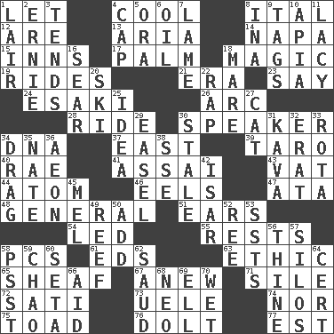 ACROSS 1. Allow 4. Calm and collected 8. Slanted text style (abbr.) 12. "We ___ not amused" (Victoria) 13. Roberta Peters solo 14. California wine valley 15. Taverns 17. Inside of hand 18. Mysterious quality of enchantment 19. Amusement-park features 21. Epoch 23. Declare 24. 1973 Nobel Price Winner (Physics) Leo 26. Curve 28. Travel on an animal 30. Orator 34. Heredity factor (abbr.) 37. Compass direction 39. Edible starchy tuberous root 40. Actress Charlotte 41. Slender Brazilian palm 43. Large container 44. Smallest unit of an element 46. Snakelike fish 47. _ moment's notice (2 wds.) 48. Commissioned military rank 51. Hearing organs 54. Directed 55. Musical pauses 58. Personal Computers (abbr.) 61. Begley and Asner 63. Value system 65. Bundle of cut stalks of grain 67. Afresh 71. Drop; flow; fall 72. Suttee (variant) 73. Ubangi River tributary 74. And not 75. Frog relative 76. Stupid person 77. Eastern Standard Time (abbr.) DOWN 1. Den 2. Bert's buddy 3. Watches over 4. Head covering 5. Mouth or opening 6. Lubricate 7. Unable to walk 8. _ tizzy (2 wds.) 9. Labels 10. Capital of Western Samoa 11. Made of lace 16. Scorch 18. Female horse 20. What Jean-Claude Killy likes to do 22. Reproach for some lapse or misdeed 25. It may be bright or harebrained 27. Domesticated feline 29. Artist's stand 30. Lacking originality or spontaneity 31. Polynesian shrub of the pepper family 32. Part of Q.E.F. 33. Roll call or roster of names 34. To draw with force 35. Nathan's nickname 36. Age 38. Compass dir. 42. Austrian river, tributary to the Danube 45. Cartoonist voice _ Blanc 49. Coral ridge 50. Increase 52. To riddle 53. Fast planes 56. One or ones belonging to thee 57. Grain storage towers 58. Inconspicuous attention getter 59. US Secretary of Labor Elaine L. _ 60. Stalk of a moss capsule 62. Saudi Arabian king (1953-1964) 64. An absolute certainty 66. Help 68. Modern: prefix 69. Pipe bend 70. Soggy