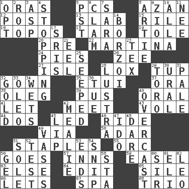 ACROSS 1. Mouths or openings 5. Personal Computers (abbr.) 8. Muslim summons to prayer 12. Mail 13. Thick slice 15. Cause heat under the collar 16. Traditional theme or motif 18. Pacific island yam 19. Lacquered or enameled metalware 20. Before (prefix) 22. Chrissie's court nemesis 24. Sliced desserts 26. Last letter of the English alphabet 27. Small island 28. Brine-cured salmon 29. Uncastrated adult male sheep 32. Long dress 35. Needle holder 37. Mouth or opening 38. Cassini of fashion 39. Fluid product of inflammation 40. Spoken 41. Allow 42. Confront 43. Short-tailed, large-bodied rat 44. Two (Sp.) 45. Directed 46. Travel on an animal 49. By way of 50. The sixth month of the Jewish calendar 51. Paper fasteners 55. The grampus (Milton) 56. Travels 57. Restaurants 59. Artist's stand 63. Otherwise 64. Prepare for publication 65. Drop; flow; fall 66. Allows 67. Health resort 68. Musical group of three DOWN 1. Choose 2. Friend of Pooh 3. Viper 4. Ceasing 5. Pacific Standard Time (abbr.) 6. Burrowing marine mollusk 7. "Two Mules for Sister ____" 8. Nick name for Arthur 9. The Jewish people; Israel 10. Silent film actress Nazimova 11. Born 14. Tall fast-moving dog breed 17. Indian titles of respect 21. Snakelike fish 23. John Ritter's dad 25. Oozed 28. A period of five years 29. "Corrida" creature 30. Mountain range 31. Diluted with white 32. Precious metal 33. Butter sub 34. Soaks 36. Third day of the wk. 40. Cloudy 42. Ear of corn 45. Mouth edge 47. Wedding promise 48. Have the gumption 49. Flower holders 51. Not divided or shared with others 52. Trial 53. Extremities 54. Sever or remove by pinching or nipping 56. Set 58. R.R. building 60. Title for a knight 61. Biblical high priest 62. Lion
