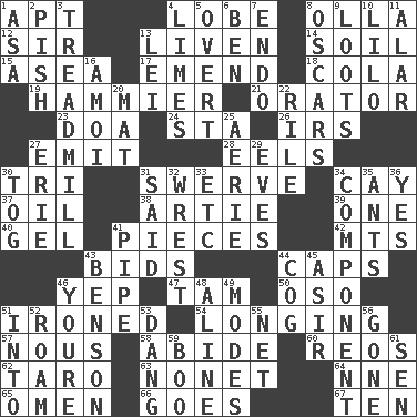 ACROSS 1. Fitting 4. Ear part 8. Water jar 12. Title for a knight 13. Make or become more lively 14. The visible part of the earth's surface 15. At sea 17. Make improvements or corrections to 18. Root beer relative 19. More given to overacting 21. Speaker 23. ___ good deed 24. R.R. building 26. Big collection agency 27. Send forth 28. Snakelike fish 30. Three (prefix) 31. Turn aside suddenly 34. Island 37. Lubricate 38. Nick name for Arthur 39. Single 40. Set 41. Components 42. Mountains (abbr.) 43. Auction offers 44. Balmoral and tarboosh 46. Slangy assent 47. Scottish cap 50. Bear (Spanish) 51. Pressed 54. Yearning 57. Horse sense 58. Tolerate 60. Vintage cars 62. Edible starchy tuberous root 63. Music written for nine 64. Compass dir. 65. Sign of something about to happen 66. Leaves 67. "___ Little Indians" DOWN 1. White ___ sheet 2. Expression of disdain 3. Excercise machine 4. Citrus fruits 5. Unconcealed 6. Benjamin's nick name 7. Inside; within (prefix) 8. Motion picture awards 9. Plunders 10. _ and Stitch 11. Having or resembling wings 13. Luau accessory 16. Mine, in Marseilles 20. Floor covering 22. Cause heat under the collar 25. Nest on high 27. One of the Great Lakes 29. Nights before holidays 30. Coat; cloak 31. Stated 32. Take or capture by force 33. And so on (abbr.) 34. Piece 35. Pismires 36. It is so 41. Corncob 43. Gillaume's butler role 44. Gear tooth 45. SW Saudi Arabia district 46. You are 48. Place in a line 49. Methods 51. To the inside or interior of 52. Wander 53. Mild oath, euphamism for damn 55. Fish or hair follower 56. Went 59. Surprise greeting 61. Elected rep.