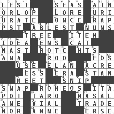 ACROSS 1. For fear that 5. Oceans 9. The 18th letter of the Arabic alphabet 12. Lowest deck of a ship 14. Old wives' tales, e.g. 15. RI univ. 16. A salt of uric acid 17. At one time in the past 18. Hit sharply and swiftly 19. Pacific Standard Time (abbr.) 20. Most capable 23. Religious women 24. Woody plant 25. A distinct part 27. It may be bright or harebrained 30. Followers of ems 32. Domesticated feline 33. Political cartoonist Thomas 34. College mil. group 36. Mountains (abbr.) 38. Santa ___, CA 39. Friend of Pooh 40. Greek goddess of the dawn 43. Purpose 46. Style 48. Land measure 49. Double-curved letter 51. Epoch 52. Comedian Laurel of Laurel & Hardy 53. Confront 54. Sever or remove by pinching or nipping 56. Fastener 58. Lover boys 61. Call ___ day 64. Cooking vessel 65. Pacific island yam 66. Relating to the nose 68. One (Scot) 69. Small bottle 70. Buy and sell 71. Or not 72. Queen of England 1702-14 73. Celtic language DOWN 1. Central Nebraska county 2. Blunders 3. Narrow board 4. Small child 5. _ gin 6. Immeasurably long periods of time 7. Northern region 8. Perceive with the eye 9. Gold (Symbol: Au) 10. SW Asia republic 11. Cuts off 13. Lightbulb-shaped fruit 21. Fermented drink made from hops 22. Poe poem 23. Remaining after all deductions 24. Make lace 26. Scottish cap 27. _ tizzy (2 wds.) 28. One of the 12 tribes of Israel 29. He sold his birthright 31. Took without asking 35. Rough 37. Religious group 41. Mouth or opening 42. Elected rep. 44. Ooze 45. Compass dir. 47. Billionth: prefix 48. Cleo's killer 50. Put through a sieve 53. Mother 55. Is not 56. Connect, as a bridge 57. Words to Nanette 59. Northwest Algerian city 60. Undercover agent 61. Austrian river, tributary to the Danube 62. Small amounts or degrees 63. Toward shelter 65. Federal power corp. 67. "We ___ not amused" (Victoria)
