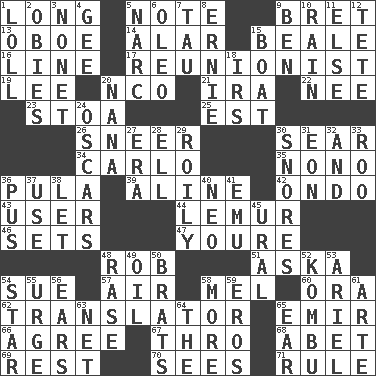 ACROSS 1. Having great length 5. Short letter 9. Cy Young winner Saberhagen 13. Mitch Miller's instrument 14. Having or resembling wings 15. Calif. Air Force Base 16. Actor's bit 17. One who advocates reunion 19. Area sheltered from the wind 20. Non-commissioned officer (abbr.) 21. Lyricist Gershwin 22. Born 23. Portico 25. Eastern Standard Time (abbr.) 26. Contemptuous expression 30. Scorch 34. Monte _, Las Vegas Hotel/Casino 35. Words to Nanette 36. Monetary unit of Botswana 39. Place in a line 42. Southwest Nigerian state 43. One who uses or employs something 44. Arboreal primate 46. Arranges properly for use 47. You are 48. Director Reiner 51. "____ silly question..." 54. Take to court 57. Wind 58. Cartoonist voice _ Blanc 60. Mouth or opening 62. Interpreter 65. Independent ruler or chieftain 66. Match 67. Through, poetically 68. Collude with 69. Repose 70. Perceives with the eye 71. General guideline DOWN 1. Hang loosely or laxly 2. Off-Broadway awards 3. Music written for nine 4. Turn to the right 5. Drug cop 6. Margarine 7. The 19th letter of the Greek alphabet 8. Bert's buddy 9. Benjamin's nick name 10. Water falling in drops from the sky 11. Otherwise 12. Wig 15. Water vessel 18. Big collection agency 20. Nanny 24. Motion picture awards 27. Epoch 28. Pipe bend 29. Turbulent 30. Sounds asleep 31. Period of immesurable duration 32. Added to 33. Friend of Pooh 36. Festering 37. Purpose 38. Allow 40. Modern: prefix 41. Australian flightless bird 45. Mountain range 48. Raze (variant) 49. Petroleum 50. Naughty children 52. Dried seaweed eaten as food 53. Satellite of Uranus 54. Play the lead 55. Goad 56. Hearing organs 58. Greater amount 59. Greek god of love 61. Johnson of "Laugh-In" 63. Fish or hair follower 64. Definite Article 65. Ewer handle