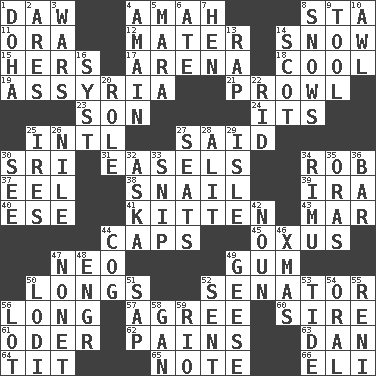 ACROSS 1. Fool 4. Nanny 8. R.R. building 11. Mouth or opening 12. Mother 14. Overwhelm 15. Possessive pronoun 17. Sports stadium 18. Calm and collected 19. Nineveh was its capital 21. Move like a hungry wolf 23. Boy, to dad 24. It is 25. International (abbr.) 27. Expressed in words 30. Indian title of respect (Mr.) 31. Artist's stands 34. Director Reiner 37. Snakelike fish 38. Slow-paced one 39. Lyricist Gershwin 40. Compass dir. 41. Baby cat 43. Spoil 44. Balmoral and tarboosh 45. Amu Darya 47. Modern: prefix 49. Chewing product 50. Yearns 52. Legislator 56. Protracted 57. Match 60. Title for a man of rank and authority 61. River in Europe 62. Aches 63. One of the 12 tribes of Israel 64. Teat (slang) 65. Short letter 66. Connecticut Ivy Leaguer DOWN 1. Capital of the state of Qatar 2. Ancient Greek god of war 3. Armed conflicts 4. At full speed 5. Hindu Mythology: god of death 6. Had dinner 7. Layer 8. Overwhelms 9. Implement 10. Leather borer 13. Reproach for some lapse or misdeed 14. Highlander 16. System (abbr.) 20. Hero or heavy, e.g. 22. To free from 25. Angers 26. "Death on the ____" 27. Theater features 28. Set down 29. Capri or Wight 30. Perceive with the eye 32. "____ silly question..." 33. Clip 34. Tall New Zealand timber tree 35. Mouths or openings 36. Long, evenly shaped piece 42. Part of speech 44. Gear tooth 46. Dec. holiday 47. Music written for nine 48. Engineer (abbr.) 49. Honkers 50. Farming town in central California 51. Plant excrement 52. Posted 53. Periodic rise and fall of the sea level 54. Spoken 55. Painter Guido (1575-1642) 56. Car dealer's back yard 58. Separate the seeds from cotton 59. River (Sp.)