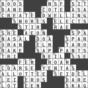 ACROSS 1. Scornful sounds 5. Science/research agcy. 8. Be seated 11. Object of repulsion 12. ____ d'Azur (French Riviera) 13. White ___ sheet 14. Make 17. Residence 19. Sounds asleep 21. Chooses 22. Use a spoon 23. Actress Charlotte 24. A female animal or person 27. Age 29. Health resort 32. Relating to the nose 34. ___ good deed 36. Practice fight 37. Northwest Algerian city 38. Shade tree 39. Pacific island yam 40. Libertine 41. Plant excrement 42. Leg coverings 43. Three (prefix) 44. Famous astronaut Armstrong 46. Compass dir. 47. Opposite of masc. 50. Wander 52. Unrefined 55. Gossips 57. One to whom something is allotted 59. Beer mug 62. Luau accessory 63. Greek god of love 64. Have the gumption 65. Car dealer's back yard 66. Car or cant ending 67. Heroin DOWN 1. English channel? 2. Boat paddle 3. Singles 4. Actors Connery and Penn 5. Immediately 6. Guide 7. Chap (slang) 8. Ketch in the Levant 9. Is not 10. Labels 12. Music discs 15. "_____ Recall" 16. 4th largest of the Great Lakes 18. Area sheltered from the wind 20. Eats (away) 24. Derisive sound 25. Ethiopian city, capital of Harari 26. 1973 Nobel Price Winner (Physics) Leo 28. Pitcher Ryan 29. Connects, as a bridge 30. Actors' quests 31. Came up 33. A saturated hydrocarbon 35. Electrical Unit 36. R.R. building 42. Food holder 45. Charged atoms 47. Away 48. First name in cosmetics 49. Distance measurement (Brit.) 51. Unmarried girls 52. Give a ring to 53. Margarine 54. Set down 55. Affirmative reply 56. Neighbor of Neb. 58. Period of immesurable duration 60. Epoch 61. Part of a journey