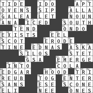 ACROSS 1. Periodic rise and fall of the sea level 5. Wedding promise 8. Fitting 11. Baking chambers 13. Small drink 14. Silent film actress Nazimova 15. An organ shaped like a helmet 16. Allow 17. Part of speech 18. Santa ___, CA 19. On the rocks 21. _ pole 22. Watch over 24. Southwest Nigerian state 25. Has an existence 27. Snakelike fish 29. Native of Scotland 30. Wear away 32. Prong on a fork 33. Ferber et al. 35. "____ silly question..." 39. Grain storage towers 41. Proofreading order 42. Girls' org. (abbr.) 43. Develop 45. To the inside or interior of 48. Root beer relative 49. _ Allan Poe 50. Parka part 52. Three (prefix) 55. Reuben's nickname 56. Coat; cloak 57. Keyboard key 59. Without 60. Compass dir. 61. Biscuitlike quick bread 62. Connecticut Ivy Leaguer 63. Born 64. Singles DOWN 1. Ancient Roman robe 2. _ the terrible 3. Accusation by an informer 4. Compass dir. 5. Small island 6. Passed on 7. Elect 8. Verbally 9. Greek god of the underworld 10. Hyperbolic tangent 12. Virtuous person 14. Soon (poet.) 20. Music discs 21. Exchanged or delivered for money 23. _____ Park, CO 25. Eastern Standard Time (abbr.) 26. One more than ninety 27. Period 28. Greek goddess of the dawn 30. Followers of ems 31. Artist's stand 33. Raised railways 34. ___ good deed 36. Ski resort town in Vermont 37. Barrel 38. Had dinner 40. Composer Stravinsky 43. Environmental prefix 44. Methods 45. Standard of perfection 46. Group of southern Bantu languages 47. Bar bills 49. Celtic language 50. Stockings 51. Double curve, resembling the letter S 53. French philosopher Descartes 54. Angers 56. Nine, plus one 58. Non-commissioned officer (abbr.)
