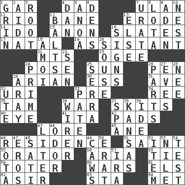 ACROSS 1. Slender fish 4. June honoree 7. ____ Bator, Mongolia 11. _ de Janeiro 12. Object of repulsion 13. Eat (away) 14. Wedding promise 15. Soon (poet.) 16. Chalkboards 17. Relating to or accompanying birth 19. Helper 21. Mountains (abbr.) 23. Double curve, resembling the letter S 24. Airs 25. Player for Phoenix 26. Animal enclosure 29. Believer in; advocate of (suffix) 30. Curvy letter 31. "___ Maria" 32. RI univ. 33. Before (prefix) 34. To sift 35. Scottish cap 36. Armed conflict 37. Burlesque acts 40. Sight organ 41. Call ___ day 42. Groovy apts. 43. Old wives' tales, e.g. 45. A saturated hydrocarbon 46. Home 51. Virtuous person 55. Speaker 56. Roberta Peters solo 58. Make a knot 59. Carrier 60. Armed conflicts 61. Raised railways 62. SW Saudi Arabia district 63. R.R. building 64. Was introduced to DOWN 1. Amused look 2. Opera by Verdi 3. Carrot, for example 4. Daniel's nick name 5. Small Philippine buffalo 6. Lairs 7. A salt of uric acid 8. Globular water bottle used in Asia 9. Arabian gulf 10. Egg locale 12. Greek mezzo-soprano Agnes 13. Otherwise 16. Signals 18. Mine, in Marseilles 20. Boozer 22. Elected rep. 24. First class 25. Father Junipero _ 26. Pieces 27. Nights before holidays 28. Born 29. Like ___ of sunshine 32. Shoshoni 33. Eucharist need 36. One who wires 37. Health resort 38. Sunflower state 39. The main thing one is thinking about 43. 61 cubic inches 44. Aroma 46. Round or rotation of duties 47. Greek god of love 48. Suttee (variant) 49. Crow sounds 50. Part of Q.E.F. 52. A distinct part 53. Mediterranean tributary 54. Trial 57. Retirement account (abbr.)