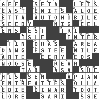 ACROSS 1. Turn to the right 4. Stalk of a moss capsule 8. Allows 12. 90 degrees 14. Sends forth 16. Medicinal plant 17. Singer James 18. Car 20. Full of seeds 22. Russian fighter aircraft 23. Snakelike fish 24. Followers of ems 25. Eastern Standard Time (abbr.) 28. Three (prefix) 30. Small island 31. Keyboard key 35. Shallow baking pan 37. Mouths or openings 40. Length times width 41. Mild oath, euphamism for damn 42. First name in cosmetics 44. The longest river in the world 45. Johnson of "Laugh-In" 46. Suggestive of the supernatural 47. Greek goddess of the dawn 48. Trap for birds or small mammals 50. Hitchcock's "____ Window" 52. Bar bill 54. White ___ sheet 55. A female animal or person 58. Part of HMS, perhaps 61. Elected rep. 63. Bee-related 65. Pleas 70. Water jar 71. Singer Brickell 72. Middle Eastern gold or silver currency 73. A blast of a horn 74. Old wives' tales, e.g. 75. Indian skirt 76. Compass dir. DOWN 1. Honkers 2. Eroded 3. _____ Park, CO 4. Ocean 5. Australian flightless bird 6. Teat (slang) 7. Smallest unit of an element 8. Experiment locale 9. Writer Wiesel 10. Lacquered or enameled metalware 11. Sew up the eyelids of hawks and falcons 13. Small amount or degree 15. Stricken, poetically 19. Legendary monster 21. Consenting reply 26. A type of plum 27. Laconic 29. More lacking in sense or substance 30. Eat 32. Musical group of three 33. Snakelike fish 34. Actress Charlotte 35. Pacific island yam 36. To the inside or interior of 38. Had dinner 39. Spanish missionary in California 41. Daniel's nick name 43. Sight organs 49. Relaxation 51. Auto club (abbr.) 53. Necklace unit 55. Grain storage towers 56. Rings 57. Related on the mother's side 58. Person who is morally reprehensible 59. Southeast Asian peninsula 60. Tumult 62. Nuclear Threat Initiatives 64. Plant holder 66. Portuguese money of account (variant) 67. _ tizzy (2 wds.) 68. Hearing organ 69. Indian title of respect (Mr.)
