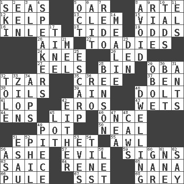 ACROSS 1. Oceans 5. Boat paddle 8. Johnson of "Laugh-In" 12. Seaweed 13. To starve (Brit.) 15. Small bottle 16. An arm off of a larger body of water 18. Periodic rise and fall of the sea level 19. Probability 20. Direct toward a target or goal 22. Sycophants 24. Leg joint 26. Directed 27. Snakelike fish 28. Storage container 29. Chief or king in Benin or Nigeria 32. Russian ruler 35. Algonquian 37. Benjamin's nick name 38. Lubricates 39. The 18th letter of the Arabic alphabet 40. Dunce 41. Chop off 42. Greek god of love 43. Soaks 44. Followers of ems 45. Mouth edge 46. Single time 49. Plant holder 50. Anneal 51. Curse 55. Leather borer 56. American tennis player Robert 57. Morally bad or wrong 59. Omens 63. Ketch in the Levant 64. French philosopher Descartes 65. Nanny 66. Whimper 67. Fast jet (abbr.) 68. Jennifer or Joel DOWN 1. What Jean-Claude Killy likes to do 2. Car or cant ending 3. Everything 4. Orators 5. Sep. follower 6. Set down 7. Do over again 8. Stay clear from 9. Travel on or in a vehicle 10. Small amounts or degrees 11. Raised railways 14. Ear of corn 17. Prong on a fork 21. Cartoonist voice _ Blanc 23. Lair 25. Fortification 28. Gillaume's butler role 29. Mitch Miller's instrument 30. Waist strap 31. Pismires 32. Lacquered or enameled metalware 33. The Jewish people; Israel 34. High mountains 36. _ de Janeiro 40. Residence 42. One or the other of two 45. Car dealer's back yard 47. Teachers' org. 48. Crow sounds 49. Part 51. Son of Isaac 52. Silvers or Donahue 53. Nights before holidays 54. Canisters 56. Viper 58. Allow 60. Slender fish 61. Compass dir. 62. Declare