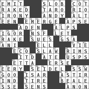 ACROSS 1. Give off 5. Messy guy 9. Small bed 12. Swept the length of 14. Pacific island yam 15. River (Sp.) 16. Literary sarcasm 17. Actor Griffith 18. The first octave above the treble staff 19. Car or cant ending 20. Develop 23. Domed church section 24. An important port of Yemen 25. High mountains 27. Russian composer Stravinsky 30. Overdraft (abbr.) 32. Allow 33. Immoral or dissolute person 34. Institutes legal proceedings 36. Girls' org. (abbr.) 38. Cuckoo 39. Pipe bend 40. Compete 43. Environmental prefix 46. Cole _ (cabbage dish) 48. Basketball hoops 49. It would 51. Had dinner 52. United States Postal Service (abbr.) 53. Singer James 54. Celtic language 56. Suggestive of the supernatural 58. Beer mug 61. Compass dir. 64. Thick or sticky substance 65. Austrian river, tributary to the Danube 66. Being in motion 68. Working for oneself (abbr.) 69. Hoop that covers a wheel 70. Calif. Air Force Base 71. Compass dir. 72. Elected reps. 73. At once, immediately (arch.) DOWN 1. 4th largest of the Great Lakes 2. Female horse 3. Visual representation of an object 4. "___ Little Indians" 5. Play the lead 6. Austrian-born American filmmaker Fritz 7. Severe or trying experience 8. Male child 9. Dice game 10. Petroleums 11. Carry 13. Colored 21. Not women's 22. Takes place subsequently 23. Flats, for short 24. "We ___ not amused" (Victoria) 26. Part of a journey 27. Retirement account (abbr.) 28. Separate the seeds from cotton 29. Migrant worker of the '30s 31. Chap (slang) 35. Scheduled 37. Deliberation 41. Mischievous child 42. Curvy letter 44. Municipality 45. Baseball player Mel 47. Past tense of be (plural) 48. Regret 50. Small ungulate mammals of Africa 53. Eat (away) 55. Broad, flat, thick piece 56. The front part of a cuirass 57. Immeasurably long periods of time 59. Merit 60. Angers 61. Comedian Laurel of Laurel & Hardy 62. Grain storage tower 63. Songbird 65. ___ a Wonderful Life 67. Ocean