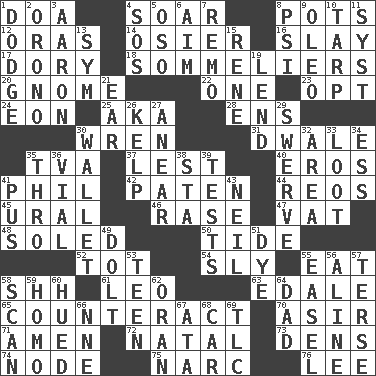 ACROSS 1. ___ good deed 4. Fly high 8. Cooking vessels 12. Mouths or openings 14. Flexible twig of a willow tree 16. Kill 17. Rowboat 18. Wine waiters 20. Dwarf 22. Single 23. Elect 24. A really long time 25. Alias (abbr.) 28. Followers of ems 30. Songbird 31. A sleeping potion; an opiate (poet.) 35. Federal power corp. 37. For fear that 40. Greek god of love 41. Silvers or Donahue 42. Eucharist need 44. Vintage cars 45. Mountain range 46. To erase 47. Large container 48. Having a sole or soles 50. Periodic rise and fall of the sea level 52. Small child 54. Secret 55. Erode 58. Quiet! 61. Lion 63. Peak District village in England 65. Act in opposition 70. SW Saudi Arabia district 71. So be it 72. Relating to or accompanying birth 73. Hiding places for outlaws 74. Thickened enlargement 75. Drug cop 76. Area sheltered from the wind DOWN 1. Evade 2. U. of Maine site 3. Composer Copland 4. Distress signal 5. Bear (Spanish) 6. Direct toward a target or goal 7. San ____ (Riviera town) 8. 23rd letter of the Greek alphabet 9. Butter sub 10. Canvas cover 11. System (abbr.) 13. Symbol (abbr.) 15. French philosopher Descartes 19. Grant temporary use of 21. Hearing organ 26. Seaweed 27. Approach 29. Turn aside suddenly 30. Place for singles 32. Type of rug 33. Plunder 34. Double-curved letter 35. Through, poetically 36. Small bottle 38. R.R. building 39. Trials 41. Purulenc 43. Famous astronaut Armstrong 49. Dunce 51. Color 53. Adolescent 55. Artist's stand 56. Place in a line 57. Laconic 58. Glance over 59. Like (prefix) 60. Took on color 62. Northwest Algerian city 64. Male parent 66. Compass dir. 67. _ moment's notice (2 wds.) 68. Automobile 69. Affectionate concern, for short