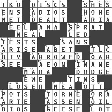 ACROSS 1. Ring climax 4. Plates 9. "______ My Girl" (Turtles hit) 13. Followers of ems 14. Goodbye (Sp.) 15. Residence 16. Fish or hair follower 17. Started a card game 18. Operatic vocal solo 19. Snakelike fish 21. Housemaid (var.) 22. Small fatty European fish 24. Actress Patricia 26. Directed 27. Trials 29. Without 30. Ascend 31. Collude with 33. Affectionate concern, for short 36. HTML Container Element 37. Moved like an arrow 40. Rowing implement 41. Observe 42. Period of immesurable duration 43. Silly 45. Hindu Mythology: god of death 47. Evade 48. She-sheep 49. Airtight sealed metal containers 50. Failure 52. Teachers' org. 54. Baseball player Mel 56. Plant holders 57. Singer Mel 59. Mouth or opening 61. Johnson of "Laugh-In" 62. NE Netherlands city 63. Lubricate 64. "Vaya con ____" 65. Honkers 66. Car dealer's back yard DOWN 1. "___ Little Indians" 2. Leg joint 3. Clearly or manifestly demonstrative 4. Male parent 5. Standard of perfection 6. Thailand, formerly 7. Root beer relative 8. Fast jet (abbr.) 9. Pottery fragments 10. Israeli folk dance 11. Give off 12. Ocean 20. Allows 22. Schedule 23. Writing instrument 25. Toward the sea 27. Small amounts or degrees 28. One of the Great Lakes 29. Stitched 31. Length times width 32. Surprise greeting 33. Inedible or poisonous agaric 34. Long (Scottish) 35. Algonquian 38. More uncommon 39. "You Light Up My Life" star Conn 44. Words to Nanette 45. Makes clutter 46. Deep reverence 49. Domesticates 50. Australian parrot (variant) 51. "Beetle Bailey" pooch 52. Olfactory organ 53. Celtic language 55. Musical group of three 56. Groovy apt. 57. Label 58. Compass dir. 60. The first octave above the treble staff