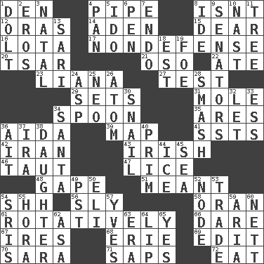 ACROSS 1. Lair 4. Corncob 8. Is not 12. Mouths or openings 14. Arabian gulf 15. Letter starter 16. Globular water bottle used in Asia 17. Unrelated to defense, as in spending 20. Russian ruler of old 21. Bear (Spanish) 22. Had dinner 23. Climbing, woody, usually tropical vines 27. Trial 29. Arranges properly for use 31. Undercover agent 34. Soup utensil 35. Ancient Greek god of war 36. Opera by Verdi 39. Atlas unit 41. Fast planes 42. SW Asia republic 43. From or relating to Ireland 46. Drawn tight 47. Louse (plural) 48. Yawn 51. Intended 54. Quiet! 56. Mischievous 58. Northwest Algerian city 61. Rotating or pertaining to rotation 66. Have the gumption 67. Angers 68. 4th largest of the Great Lakes 69. Prepare for publication 70. "Two Mules for Sister ____" 71. Plant excrements 72. Erode DOWN 1. Dunce 2. Greek god of love 3. Brizilian seaport 4. Baking dish 5. Wedding promise 6. Animal enclosure 7. Inside; within (prefix) 8. Binary compound 9. Legislators 10. Political cartoonist Thomas 11. Family _ (genealogy) 13. Indian skirt 18. Eastern Standard Time (abbr.) 19. Enemy 24. Viper 25. Modern: prefix 26. Tiny particle 28. Box-office sellout 30. Slow-paced one 32. Allow 33. Curvy letter 34. Before Barbara or Clara 36. Small island 37. Lyricist Gershwin 38. Female child 40. Demure 44. Frozen water 45. Ocean 49. Pacific Standard Time (abbr.) 50. Biblical high priest 52. Connecting point 53. Buy and sell 54. Indian titles of respect 55. Israeli folk dance 57. Jacques Cousteau's middle name 59. Roberta Peters solo 60. Remaining after all deductions 62. White ___ sheet 63. Period 64. Mouth edge 65. Consenting reply