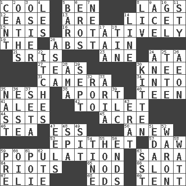 ACROSS 1. Calm and collected 5. Benjamin's nick name 8. Fails to keep up a pace 12. Comfort 13. "We ___ not amused" (Victoria) 14. It is permitted: Lat. 15. Nuclear Threat Initiatives 16. Happening in regular succession 19. Definite Article 20. Refrain by choice 21. Indian titles of respect 23. One (Scot) 24. _ moment's notice (2 wds.) 27. Beverages made from leaves 30. Leg joint 31. Device for capturing images 34. To the inside or interior of 35. Tender 38. To the left, to Queeg 40. Adolescent 41. Toward shelter 42. Rest room 44. Fast planes 45. Measure of real estate 46. Beverage made from leaves 47. Curvy letter 50. Afresh 53. Curse 57. Simpleton 59. Census information 63. "Two Mules for Sister ____" 64. Disturbances 65. Allow head to fall sleepily 66. Notch 67. Writer Wiesel 68. Begley and Asner 69. Portable shelter DOWN 1. Penny 2. Expletives 3. Flexible twig of a willow tree 4. French article 5. Sharp remark 6. Greek god of love 7. Remaining after all deductions 8. 54 in ancient Rome 9. Adept person 10. Set 11. Filthy place 14. Actor's bit 17. American Automobile Association (abbr.) 18. Metal container 20. Toward the sea 22. Irritating cutaneous sensations 24. Queen of England 1702-14 25. False hair 26. Period of immesurable duration 28. Nursemaid (var.) 29. Back-to-school mo. 30. Baby cat 32. Friend of Pooh 33. Operatic vocal solo 35. Political cartoonist Thomas 36. Otherwise 37. Bristle 39. Affectionate concern, for short 43. Part of Q.E.F. 47. Snakelike fish 48. Health resort 49. Be seated 51. Peak District village in England 52. Make _____ (do battle with) 54. Prong on a fork 55. Parka part 56. Conclusions 58. Electrical Unit 59. Before (prefix) 60. Petroleum 61. Luau course 62. Shoshoni 63. Fast jet (abbr.)