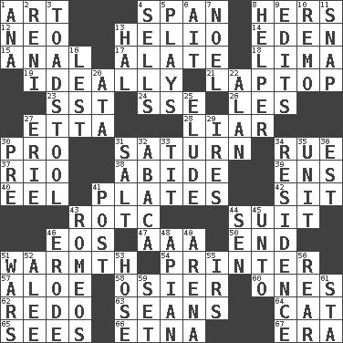 ACROSS 1. Nonscientific branch of learning 4. Connect, as a bridge 8. Possessive pronoun 12. Modern: prefix 13. Sun: prefix 14. Locale of original sin 15. Of or related to the anus 17. Having winglike extensions 18. Pale green bean 19. Under perfect conditions 21. Portable computer 23. Fast jet (abbr.) 24. Compass dir. 26. French article 27. Singer James 28. One who doesn't tell the truth 30. Adept person 31. Titan orbits this 34. Regret 37. River (Sp.) 38. Stay 39. Followers of ems 40. Snakelike fish 41. Food holders 42. Be seated 43. College mil. group 44. Set of matching outer garments 46. Greek goddess of the dawn 47. Auto club (abbr.) 50. Conclude 51. Heat 54. Hard copy producer 57. Medicinal plant 58. Flexible twig of a willow tree 60. Singles 62. Redecorate 63. Actors Connery and Penn 64. Domesticated feline 65. Perceives with the eye 66. Inactive volcano in Sicily 67. Period DOWN 1. Santa ___, CA 2. Painter Guido (1575-1642) 3. Inedible or poisonous agaric 4. Exchanges for money 5. Romps 6. Small island 7. Christmas carol 8. Assistant 9. Prepares for publication 10. San ____ (Riviera town) 11. Fastener 13. Actor Linden 16. For fear that 20. "One Day ___ Time" 22. Actor Alda or Thicke 25. Evade 27. 4th largest of the Great Lakes 29. Angers 30. Before (prefix) 31. Table seasoning 32. Phillipine bananalike plant 33. Teat (slang) 34. Dwelling 35. A single undivided whole 36. Eastern Standard Time (abbr.) 41. Mail 43. Lover boys 44. Elected rep. 45. To (old English) 46. Wear away 48. Bee-related 49. Sports stadium 51. Armed conflicts 52. Toward shelter 53. Stockings 55. Big collection agency 56. Posterior 59. Arrange properly for use 61. R.R. building