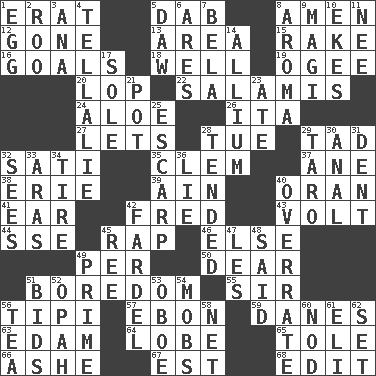 ACROSS 1. Part of Q.E.F. 5. Pat or tap gently 8. So be it 12. Went 13. Type of rug 15. Immoral or dissolute person 16. Scores awarded for successful feats 18. Water source 19. Double curve, resembling the letter S 20. Chop off 22. Deli grouping 24. Medicinal plant 26. Call ___ day 27. Allows 28. Third day of the wk. 29. Small boy 32. Suttee (variant) 35. Clement's nick name 37. One (Scot) 38. 4th largest of the Great Lakes 39. The 18th letter of the Arabic alphabet 40. Northwest Algerian city 41. Hearing organ 42. Flintstone 43. Electrical Unit 44. Compass dir. 45. Reproach for some lapse or misdeed 46. Otherwise 49. For each 50. Letter starter 51. Mood resulting from idleness 55. Title for a knight 56. Native american tent (variation) 57. Inky black, to poets 59. Natives or inhabitants of Denmark 63. Dutch treat 64. Ear part 65. Lacquered or enameled metalware 66. American tennis player Robert 67. Eastern Standard Time (abbr.) 68. Prepare for publication DOWN 1. Oval reproductive body of a fowl 2. Friend of Pooh 3. Santa ___, CA 4. Copy Pinocchio 5. Simpleton 6. Ancient Greek god of war 7. Actor Lugosi 8. Odor 9. Wise men 10. Makes supply last 11. Born 14. Plant genus of onion and garlic 17. Not divided or shared with others 21. Cooking vessel 23. Had dinner 25. Fortification 28. Watched over 29. Edible starchy tuberous root 30. Of or related to the anus 31. Incision 32. Observes 33. Caspian sea tributary 34. Become fatigued 36. Falsehood 40. Make much ado about nothing 42. Bundle 45. Portuguese money of account (variant) 47. French article 48. Alleged 49. A-one 51. Auction offers 52. Brightly colored fish 53. Mitch Miller's instrument 54. Disorderly crowds 56. Beverage made from leaves 58. Fish or hair follower 60. Allow head to fall sleepily 61. Connecticut Ivy Leaguer 62. Put into a specified state