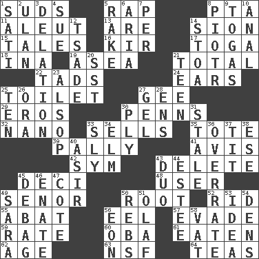 ACROSS 1. Soap bubbles 5. Strike 8. Parent Teacher Assoc. 11. Native American of Southwest Alaska 13. "We ___ not amused" (Victoria) 14. The Jewish people; Israel 15. Stories 16. Apertif with cassis 17. Ancient Roman robe 18. _ tizzy (2 wds.) 19. At sea 21. "_____ Recall" 22. Small amounts or degrees 24. Hearing organs 25. Bathroom plumbing fixture 27. Turn to the right 29. Greek god of love 30. Actor Sean's family 32. Billionth: prefix 33. Makes a sale 35. Carry 39. Chummy 41. Advice 42. Symbol (abbr.) 43. Erase 45. Tenth: prefix 48. One who makes use of a thing 49. Sir (Sp.) 50. Carrot, for example 52. To free from 55. Blind as ____ 56. Snakelike fish 57. Elude 59. Assign a rank or rating to 60. Chief or king in Benin or Nigeria 61. Ingested 62. Ripen 63. Science/research agcy. 64. Afternoon social gatherings DOWN 1. Suttee (variant) 2. Uhlan (variant) 3. Conveyance 4. Take to court 5. Immoral or dissolute person 6. Roberta Peters solo 7. For each 8. Peter (Polish) 9. Ancient Roman robes 10. Of or related to the anus 12. Sadhe (variant) 14. Portico 20. Fast jet (abbr.) 21. Adolescent 23. Columnist Joseph or Stewart 25. "___ Little Indians" 26. Mouth or opening 27. Set 28. Followers of ems 30. Apply oneself diligently 31. Lacking originality or spontaneity 33. Roguish 34. Shade tree 36. Make much ado about nothing 37. Teat (slang) 38. Compass dir. 40. SW Saudi Arabia district 43. Superhero pair 44. First name in cosmetics 45. Debunk (Brit. slang) 46. Maternal 47. ____ d'Azur (French Riviera) 49. "Two Mules for Sister ____" 50. Confederate soldiers (slang) 51. Norwegian king 53. It may be bright or harebrained 54. Hiding places for outlaws 56. Age 58. Large container