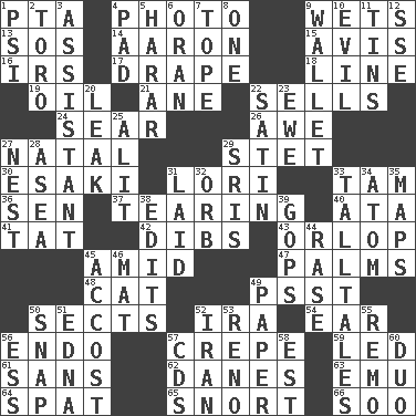 ACROSS 1. Parent Teacher Association (abbr.) 4. Picture 9. Soaks 13. Distress signal 14. Composer Copland 15. Opinion 16. Big collection agency 17. Window treatment 18. Actor's bit 19. Lubricate 21. A saturated hydrocarbon 22. Makes a sale 24. Dry up 26. Deep reverence 27. Brizilian seaport 29. Proofreading order 30. 1973 Nobel Price Winner (Physics) Leo 31. Australian parrot (variant) 33. Scottish cap 36. Elected rep. 37. Separating forcefully 40. "One Day ___ Time" 41. Make lace 42. Claim 43. Lowest deck of a ship 45. Among 47. Insides of hands 48. Feline 49. Inconspicuous attention getter 50. Religious groups 52. Lyricist Gershwin 54. Ewer handle 56. Inside; within (prefix) 57. Streamer paper 59. Directed 61. Without 62. Natives or inhabitants of Denmark 63. Australian flightless bird 64. Petty quarrel 65. Derisive sound 66. "Barney Miller" actor Jack DOWN 1. Air pressure measure (abbr.) 2. "Corrida" creature 3. Helper 4. Groovy apt. 5. Ethiopian city, capital of Harari 6. Northwest Algerian city 7. Drink excessively 8. Single 9. Place for singles 10. Morally bad or wrong 11. Canisters 12. Compass dir. 20. Path through which fluid escapes 22. Smooth fabric 23. She-sheep 25. Set down 27. Egg locale 28. At sea 29. Indian titles of respect 31. Put down 32. Globe 33. Baron Munchausen's specialties 34. Smallest unit of an element 35. Atlas contents 38. Prepares for publication 39. Republicans 44. To erase 45. Buttonhole 46. Floor protector 49. Some stationery 50. Fastener 51. Pulitzer Prize-winning author Ferber 52. SW Asia republic 53. Former U.S. Attorney General Janet 55. San ____ (Riviera town) 56. Double-curved letter 57. Music discs 58. Eastern Standard Time (abbr.) 60. Superhero pair