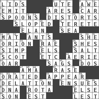 ACROSS 1. Hats (slang) 5. Shoshoni 8. Deep reverence 11. Give off 12. Ancient Greek god of war 13. 4-wheeled motor vehicle 14. Soup utensils 17. What propaganda does 19. Slanted 21. Cylindrical with tapered ends 22. Style 23. Ocean 24. Floor covering 27. Pismires 29. A female animal or person 32. Greek mythologigal hunter 34. Actress Charlotte 36. "______ My Girl" (Turtles hit) 37. Simple or foolish person 38. Raised railways 39. Table seasoning 40. Highlander 41. And so on (abbr.) 42. Nest on high 43. Boat paddle 44. Settles 46. Two (Sp.) 47. Housemaid (var.) 50. To erase 52. Declaimed 55. Seem 57. Accusation by an informer 59. Takes place subsequently 62. Heredity factor (abbr.) 63. Roll call or roster of names 64. Otherwise 65. Boy, to dad 66. Eastern Standard Time (abbr.) 67. For fear that DOWN 1. French article 2. Mischievous child 3. "Vaya con ____" 4. Fur scarf 5. RI univ. 6. Trials 7. First name in cosmetics 8. Measure of real estate 9. Electrical Unit 10. Celtic language 12. Find the sum of 15. Pitcher Ryan 16. Connect, as a bridge 18. Mouth or opening 20. Main course 24. With motion or animation 25. N. Chile seaport 26. The easternmost of the Lesser Sundas 28. Table seasonings 29. Broken piece 30. Sun: prefix 31. _____ Park, CO 33. Elect 35. Fortification 36. Compass dir. 42. NE Netherlands city 45. Stare wonderingly 47. _ moment's notice (2 wds.) 48. Distance measurement (Brit.) 49. Goodbye (Sp.) 51. Artist's stand 52. Likelihood 53. Western Nevada city 54. Actor Alda or Thicke 55. Santa ___, CA 56. General guideline 58. Baseball player Mel 60. Curvy letter 61. Put into a specified state