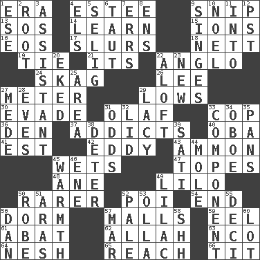 ACROSS 1. Epoch 4. First name in cosmetics 9. Clip 13. Mayday 14. Acquire or gain knowledge or skills 15. Charged atoms 16. Greek goddess of the dawn 17. Plays smoothly or legato 18. Remaining after all deductions 19. Standoff 21. It is 22. White American of non-Hispanic descent 24. Heroin 26. Area sheltered from the wind 27. Distance measurement 29. Moos 30. Elude 31. Norwegian king 33. Police officer (slang) 36. Lair 37. Inveterate users 40. Chief or king in Benin or Nigeria 41. Eastern Standard Time (abbr.) 42. Whirlpool 43. ID or VA city 45. Soaks 47. Drinks excessively 48. A saturated hydrocarbon 49. _ and Stitch 50. More uncommon 52. Luau course 54. Conclude 56. Dormintory (informal) 57. Promenades 59. Snakelike fish 61. Blind as ____ 62. Assad's deity 63. Non-commissioned officer (abbr.) 64. Delicate 65. Arrive at 66. Teat (slang) DOWN 1. Compass dir. 2. Carrot, for example 3. Helper 4. Raised railways 5. Major League Baseball Commissioner Bud 6. Pulled tight 7. Blunders 8. Followers of ems 9. Scorches 10. Christmas carol 11. To the inside or interior of 12. Pacific Standard Time (abbr.) 20. Made supply last 22. At or to great height 23. ___ Haven, CT 25. Type of rug 27. Ancient Persian 28. Nights before holidays 29. Made of lace 31. Likelihood 32. Hat (slang) 33. Part 34. Mitch Miller's instrument 35. Zero-star reviews 38. Prevent from occurring 39. Suttee (variant) 44. Undercover agent 45. Heat 46. Compass dir. 49. Pale purple color 50. Loose flowing garment 51. Caspian sea tributary 52. Light colored 53. Water jar 55. Tenth: prefix 56. One of the 12 tribes of Israel 57. Third mo. 58. Quiet! 60. Car dealer's back yard
