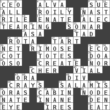 ACROSS 1. Corporate head (abbr.) 4. Inventor's middle name 8. Take to court 11. 100% 12. Turbulent 14. Political cartoonist Thomas 15. Cause heat under the collar 17. Maternal 18. Actor Baldwin 19. Pulling into pieces 21. Echolocation 23. White ___ sheet 24. Small amount or degree 25. Roll call or roster of names 27. Small pie 30. Fish or hair follower 31. Full of chinks, cracks, or crevices 34. Environmental prefix 37. Small bed 38. Lugs 39. ___ good deed 40. Bear (Spanish) 41. Make 43. Or not 44. "Mermaids" star 45. Small bottle 47. Mouth or opening 49. HTML Container Element 50. Trading vessels 52. Deli grouping 56. Mouths or openings 57. Small house or cottage 60. Connecting point 61. Nathan's nickname 62. Silly 63. Lair 64. Sight organ 65. Angers 66. Erode DOWN 1. Heavy open wagon 2. Writer Wiesel 3. Water jar 4. Sports stadium 5. Having great length 6. By way of 7. Keyboard modifier key 8. First course 9. One who makes use of a thing 10. And so on (abbr.) 13. It is so 14. Nanny 16. Part of Q.E.F. 20. Austrian river, tributary to the Danube 22. Baseball player Mel 25. Vintage cars 26. "Beetle Bailey" pooch 27. Carrier 28. At sea 29. Respite 30. Non-commissioned officer (abbr.) 32. Hankering 33. Greater amount 34. Pulitzer Prize-winning author Ferber 35. Calm and collected 36. Rowing implement 42. Tending to cause great harm 44. Island 46. "Terrible" tsar 47. Speak pompously 48. To erase 49. Natives or inhabitants of Denmark 50. Supercomputer manufacturer 51. _-fi 52. Trig term 53. Method 54. The main thing one is thinking about 55. Emitted 56. Single 58. Black tropical American cuckoo 59. Long, evenly shaped piece