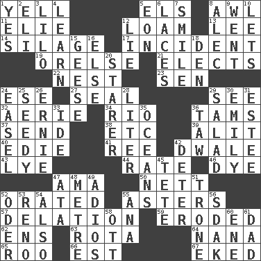 ACROSS 1. Shout 5. Raised railways 8. Leather borer 11. Writer Wiesel 12. Rich soil 13. Area sheltered from the wind 14. Fodder prepared in a silo 17. Happening 19. Threatening words 21. Chooses 22. Egg locale 23. Elected rep. 24. Compass dir. 27. Lick closed 29. Observe 32. Nest on high 34. _ de Janeiro 36. Scottish caps 37. Transmit 38. And so on (abbr.) 39. Set down 40. Singer Brickell 41. To separate or throw off 42. A sleeping potion; an opiate (poet.) 43. Sodium hydroxide 44. Assign a rank or rating to 46. Color 47. Nursemaid (var.) 50. Remaining after all deductions 52. Declaimed 55. Michaelmas daisies 57. Accusation by an informer 59. Worn away 62. Followers of ems 63. Round or rotation of duties 64. Grandmother 65. Friend of Pooh 66. Eastern Standard Time (abbr.) 67. Made supply last DOWN 1. It is so 2. Connecticut Ivy Leaguer 3. _ and Stitch 4. Memorize 5. Age 6. Shoestrings 7. Grin 8. Actor Baldwin 9. Gone 10. Allows 12. Untruth 15. Honkers 16. Otherwise 18. Lair 20. A viewer who gazes fixedly 24. Artist's stand 25. Full of seeds 26. Bert's buddy 28. 61 cubic inches 29. Vegetable dish 30. Poet Dickinson 31. First name in cosmetics 33. Binary compound 35. Seas 36. The 23rd letter of the Hebrew alphabet 42. Prevent from occurring 45. Wig 47. _ moment's notice (2 wds.) 48. Distance measurement (Brit.) 49. Goodbye (Sp.) 51. Marketplace scale 52. Baltic tributary 53. Western Nevada city 54. In addition 55. Santa ___, CA 56. Neighbor of Neb. 58. Baseball player Mel 60. Compass dir. 61. Male parent