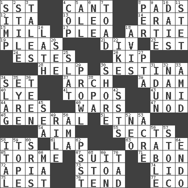 ACROSS 1. Fast jet (abbr.) 4. Patter 8. Groovy apts. 12. Call ___ day 13. Butter sub 14. Part of Q.E.F. 15. Place where flour is made 17. Entreaty 18. Nick name for Arthur 19. Entreaties 21. HTML Container Element 23. Eastern Standard Time (abbr.) 24. _____ Park, CO 26. Monetary unit of Laos 28. Assist 30. French poetic form 34. Arrange properly for use 37. Bowlike part 39. First man 40. Sodium hydroxide 41. Literary convention 43. University (slang) 44. Ancient Greek god of war 46. Armed conflicts 47. Lower and raise head in agreement 48. Commissioned military rank 51. Inactive volcano in Sicily 54. Direct toward a target or goal 55. Religious groups 58. It is 61. Pet locale 63. Declaim 65. Singer Mel 67. Set of matching outer garments 71. Inky black, to poets 72. Capital of Western Samoa 73. Portico 74. Flaplike covering 75. For fear that 76. Watch over 77. Environmental prefix DOWN 1. Simple or foolish person 2. Vertical member of a panel or frame 3. Stories 4. Police officer (slang) 5. Everything 6. Born 7. Frog relative 8. For each 9. Johnson of "Laugh-In" 10. Raised platform 11. Proofreading order 16. Thin strip of wood or metal 18. Deliberation 20. Observe 22. Mamie's husband 25. Narrow board 27. Parent Teacher Assoc. 29. Move like a hungry wolf 30. Dinah or Pauly 31. Goddess of spring and wife of Bragi 32. Billionth: prefix 33. Among 34. Volcanic refuse 35. Jane of fiction 36. Adolescent 38. Accounting whiz (abbr.) 42. Fast planes 45. Ocean 49. Cause heat under the collar 50. Nanny (var.) 52. Modern: prefix 53. Measure of real estate 56. Eating place 57. Unemotional 58. Slanted text style (abbr.) 59. Drink excessively 60. Indian titles of respect 62. Inconspicuous attention getter 64. Inside; within (prefix) 66. Floor covering 68. Shoshoni 69. Electrically charged atom 70. Small boy