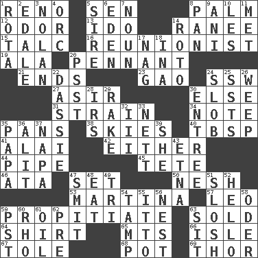 ACROSS 1. Western Nevada city 5. Elected rep. 8. Inside of hand 12. Scent 13. Wedding promise 14. Indian princess (variant) 15. Baby powder 16. One who advocates reunion 19. Wing 20. Pre-World Series prize 21. Extremities 23. E Mali city 24. Compass dir. 27. SW Saudi Arabia district 30. Otherwise 31. Put through a sieve 34. Observe 35. Baking dishes 38. Atmospheres 40. Cook's measure (abbr.) 41. Jai ____ 42. One or the other of two 44. Corncob 45. False hair 46. "One Day ___ Time" 47. Arrange properly for use 50. Delicate 53. Chrissie's court nemesis 57. Lion 59. Appease 63. Disposed of to a purchaser 64. Chest covering 65. Mountains (abbr.) 66. Small island 67. Lacquered or enameled metalware 68. Cooking vessel 69. Son of Odin DOWN 1. Round or rotation of duties 2. Peak District village in England 3. Pitcher Ryan 4. The grampus (Milton) 5. The founder of a family 6. Locale of original sin 7. Part of speech 8. Baking dish 9. Black tropical American cuckoo 10. French article 11. Was introduced to 14. Printing process, for short 17. Tired old horse 18. _ tizzy (2 wds.) 20. Inconspicuous attention getter 22. Hyrax 24. Messy guy 25. Fast planes 26. Shed a tear 28. Big collection agency 29. Libertine 30. Main course 32. One more than two 33. Remaining after all deductions 35. Dad 36. Came down and settled, as after flight 37. California wine valley 39. A female animal or person 43. Inactive volcano in Sicily 47. Stricken, poetically 48. Erode 49. Three (prefix) 51. Agitate, as a liquid 52. Phone greeting 54. Pack (down) 55. "Tell ____ the Marines!" 56. Egg locale 58. River in Europe 59. Pacific Standard Time (abbr.) 60. 17th letter of the Greek alphabet 61. Lubricate 62. Before (prefix) 63. Be seated