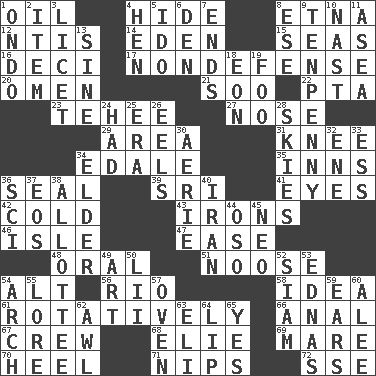 ACROSS 1. Petroleum 4. Flintstone garb 8. Inactive volcano in Sicily 12. Nuclear Threat Initiatives 14. Locale of original sin 15. Oceans 16. Tenth: prefix 17. Unrelated to defense, as in spending 20. Presage 21. "Barney Miller" actor Jack 22. Parent Teacher Association (abbr.) 23. Giggle 27. Sense of smell 29. Type of rug 31. Leg joint 34. Peak District village in England 35. Restaurants 36. Lick closed 39. _ Lanka 41. Sight organs 42. Lacking warmth 43. Metal shackles 46. Small island 47. Comfort 48. Relating to the mouth 51. Trap for birds or small mammals 54. The first octave above the treble staff 56. River (Sp.) 58. The content of cognition 61. Producing rotation 66. Of or related to the anus 67. Ship's personnel 68. Writer Wiesel 69. Female horse 70. Person who is morally reprehensible 71. Cuts off 72. Compass dir. DOWN 1. Southwest Nigerian state 2. Detail 3. It is permitted: Lat. 4. Layer 5. Wedding promise 6. Lair 7. Extremities 8. Compass dir. 9. 3-inch nail 10. Political cartoonist Thomas 11. At sea 13. Trig term 18. Period of immesurable duration 19. Egg _ yung 24. Possessed 25. Period 26. Snakelike fish 28. Atmospheres 30. Nest on high 32. Compass dir. 33. Double-curved letter 34. A person who is older than you are 36. _-fi 37. Greek goddess of the dawn 38. One to whom something is allotted 40. SW Asia republic 44. Bear (Spanish) 45. Modern: prefix 49. Tate display 50. Cards in a Roman deck? 52. Thailand, formerly 53. Ferber et al. 54. Bowlike part 55. Old wives' tales, e.g. 57. Baking chamber 59. Hearing organs 60. Toward shelter 62. Leather borer 63. Biblical high priest 64. Mouth edge 65. It is so