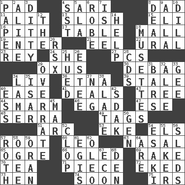 ACROSS 1. Writing tablet 4. Indian skirt 8. June honoree 11. Came down and settled, as after flight 13. Make a splashing sound 15. Connecticut Ivy Leaguer 16. Essential or central part 17. Eating place 18. Promenade 19. Keyboard key 21. Snakelike fish 22. Mountain range 23. Marina Del _, California 24. A female animal or person 27. Personal Computers (abbr.) 29. The longest river in Central Asia 30. Debunk (Brit. slang) 34. 54 in ancient Rome 36. Inactive volcano in Sicily 39. Having lost freshness 40. Relaxation 41. Allots cards 43. Relationship diagram 44. Excessive but superficial compliments 46. Mild oath 47. Compass dir. 48. Spanish missionary in California 49. Labels 51. Curve 53. Make supply last 54. Raised railways 57. Carrot, for example 60. Lion 63. Relating to the nose 65. Legendary monster 66. Stared at amorously 69. Libertine 70. Beverage made from leaves 71. Part 72. Supplemented with great effort 73. Layer 74. Within a short period 75. Big collection agency DOWN 1. Some stationery 2. Place in a line 3. Short, simple song 4. Fast jet (abbr.) 5. Wing 6. Loose flowing garment 7. Small island 8. Letter starter 9. Silent film actress Nazimova 10. Deli pickle 12. Definite Article 14. Assist 18. French bagpipes 20. Acura sports coupe 25. Took on color 26. First name in cosmetics 28. Music discs 29. Make much ado about nothing 31. Oblong pieces of solid material 32. Toward shelter 33. Unit of force equal to gravity 34. Unable to walk 35. Austrian river, tributary to the Danube 37. Tired old horse 38. Having winglike extensions 40. Curvy letter 42. Neighbor of Neb. 45. Make imperfect 50. Commissioned military rank (abbr.) 52. Hoof sound 54. 1973 Nobel Price Winner (Physics) Leo 55. Member of a famous L.A. basketball team 56. Bobsleighs 57. Writer of Portnoy's Complaint (1969) 58. Double curve, resembling the letter S 59. NW Algerian seaport 61. Armor plate that protects the chest 62. Butter sub 64. "We ___ not amused" (Victoria) 67. Environmental prefix 68. Lair