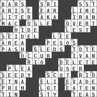 ACROSS 1. Long, evenly shaped pieces 5. _ Lanka 8. Fast jet (abbr.) 11. Originate 13. Hearing organ 14. Welles in "The Third Man" 15. 61 cubic inches 16. Alias (abbr.) 17. SW Asia republic 18. Big _ 19. Stare 21. Unconcealed 22. Flintstone garb 24. For fear that 25. A glass for beer 27. Area sheltered from the wind 29. Length times width 30. Mexican monetary units 32. Romantic infatuation 33. Bobsleighs 35. Carry 39. Happen 41. _ the terrible 42. _ de Janeiro 43. Erase 45. Entreaty 48. One who makes use of a thing 49. Shabby and untidy 50. Native of Scotland 52. To free from 55. Inactive volcano in Sicily 56. Connecticut Ivy Leaguer 57. Elude 59. Demure 60. Car dealer's back yard 61. Ingested 62. Shallow baking pan 63. Filthy place 64. Afternoon social gatherings DOWN 1. Lip ointment 2. Operatic vocal solo 3. Actors Guy, Robert Welles, and Clint 4. Compass dir. 5. Lick closed 6. Immoral or dissolute person 7. Retirement account (abbr.) 8. Begets 9. Don Adams' spy role 10. Portable shelter 12. Eat (away) 14. Moving, as bait 20. Set 21. Margarine 23. Potato state 25. Plant excrement 26. Period 27. Directed 28. Curvy letter 30. For each 31. Vertical member of a panel or frame 33. _-fi 34. Nilotic language 36. Make much ado about nothing 37. Make lace 38. Compass dir. 40. Supercomputer manufacturer 43. Superhero pair 44. First name in cosmetics 45. _ dish (used to culture cells) 46. Soviet premier 1918-24 47. Dutch treat 49. Back-to-school mo. 50. Narrow opening 51. Municipality 53. The main thing one is thinking about 54. Hiding places for outlaws 56. Raised railways 58. Large container