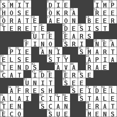 ACROSS 1. Stricken, poetically 5. Expire 8. Mischievous child 11. Flexible conduit 12. Gumbo ingredient 14. Portuguese money of account (variant) 15. Declaim 17. A really long time 18. Fermented drink made from hops 19. Cigar-shaped 21. Stop 23. Shoshoni 25. Hearing organs 26. A pale, very dry sherry 27. _ Lanka 28. Teachers' org. 31. Sliced dessert 33. Cuckoo 35. Don Adams' spy role 37. Otherwise 38. Filthy place 40. Capital of Western Samoa 41. Is inclined (to) 43. Actress Gardner 45. Actress Charlotte 46. Feline 47. Binary compound 50. Celtic language 52. A single undivided whole 53. Observe 54. Anew 56. A glass for beer 61. Mountain range southwest of Kyrgyzstan 62. Quote 65. Showing deterioration from age 66. Nine, plus one 67. Glance over 68. Part of Q.E.F. 69. Environmental prefix 70. Take to court 71. Not women's DOWN 1. Opportunity 2. Greater amount 3. Austrian river, tributary to the Danube 4. False hair 5. ___ good deed 6. Eisenhower's nickname 7. Eats (away) 8. Angers 9. Confront 10. For each 13. Approach 16. Needle holder 18. Altar cloth linen 20. Inactive volcano in Sicily 22. Indian titles of respect 24. Immeasurably long periods of time 26. Nourish 28. California wine valley 29. One of the Great Lakes 30. _ moment's notice (2 wds.) 31. Entreaty 32. Is not 34. Call ___ day 36. Female horse 37. And so on (abbr.) 39. Jacques Cousteau's middle name 42. Trig term 44. Ancient Greek god of war 48. Plates 49. Value system 51. Perceives with the eye 52. RI univ. 54. Actor Baldwin 55. Papal veil 57. Detail 58. Have the gumption 59. Flair 60. Allows 61. Had dinner 63. The 19th letter of the Greek alphabet 64. Compass dir.
