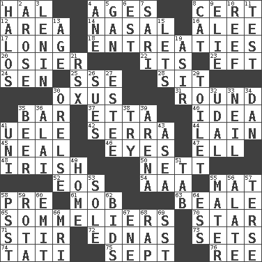 ACROSS 1. Actor Linden 4. Eras 8. Sure thing 12. Length times width 14. Rhinal 16. Toward shelter 17. Protracted 18. Pleas 20. Flexible twig of a willow tree 22. ___ a Wonderful Life 23. Bank Draft (abbr.) 24. Elected rep. 25. Compass dir. 28. Be seated 30. The longest river in Central Asia 31. One shot 35. Long, evenly shaped piece 37. Singer James 40. The main thing one is thinking about 41. Ubangi River tributary 42. Spanish missionary in California 44. (Had) reclined 45. Be tempered by heat 46. Sight organs 47. Pipe bend 48. From or relating to Ireland 50. Remaining after all deductions 52. Greek goddess of the dawn 54. Auto club (abbr.) 55. Floor protector 58. Before (prefix) 61. Disorderly crowd 63. Calif. Air Force Base 65. Wine waiters 70. Play the lead 71. Use a spoon 72. Ferber et al. 73. Puts into a specified state 74. Jacques of French films 75. Back-to-school mo. 76. To riddle DOWN 1. Rings 2. Came up 3. Soviet premier 1918-24 4. One (Scot) 5. Separate the seeds from cotton 6. Eastern Standard Time (abbr.) 7. Indian skirt 8. Domesticated feline 9. Writer Wiesel 10. Coral ridge 11. Trial 13. Personal question 15. Allows 19. SW Saudi Arabia district 21. Acura sports coupe 26. Takes to court 27. First name in cosmetics 29. Rest room 30. Threatening words 32. Freehold land 33. Famous astronaut Armstrong 34. Daniel's nick name 35. Fermented drink made from hops 36. Jai ____ 38. Attempt to accomplish something 39. Sports stadium 41. University (slang) 43. Toward the sea 49. Residence 51. Bar bill 53. Not divided or shared with others 55. Mother 56. Having winglike extensions 57. Laconic 58. Inconspicuous attention getter 59. Roll call or roster of names 60. Give off 62. Auction offers 64. Double-curved letter 66. Medical imaging device (abbr.) 67. Compass dir. 68. Hit sharply and swiftly 69. Fast jet (abbr.)