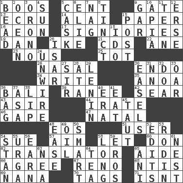 ACROSS 1. Scornful sounds 5. Penny 9. Yard entry 13. Shade of tan 14. Mountain range southwest of Kyrgyzstan 15. Some stationery 16. A really long time 17. Seigniories (variant) 19. One of the 12 tribes of Israel 20. D.D.E's nickname 21. Music discs 22. One (Scot) 23. Good sense 25. Small child 26. Relating to the nose 30. Inside; within (prefix) 34. Compose 35. Small Philippine buffalo 36. Indonesian resort city 39. Indian princess (variant) 42. Dry up 43. SW Saudi Arabia district 44. Feeling or showing extreme anger 46. Stare wonderingly 47. Relating to or accompanying birth 48. Greek goddess of the dawn 51. One who makes use of a thing 54. Take to court 57. Direct toward a target or goal 58. Allow 60. Spanish title 62. Interpreter 65. Helper 66. Match 67. Former U.S. Attorney General Janet 68. Nuclear Threat Initiatives 69. Nanny 70. Labels 71. Is not DOWN 1. Necklace unit 2. Sea 3. U. of Maine site 4. Player for Phoenix 5. Keg 6. Writer Wiesel 7. Tired old horse 8. Tinged 9. Slender fish 10. Capital of Western Samoa 11. Adolescent 12. Celtic language 15. Mail 18. Wedding promise 20. Austrian river, tributary to the Danube 24. Undo the wiring of 27. Title for a knight 28. _ moment's notice (2 wds.) 29. Soviet premier 1918-24 30. Artist's stands 31. Compass dir. 32. ___ good deed 33. Boat paddle 36. Container for groceries 37. White ___ sheet 38. Mouth edge 40. Epoch 41. Ingest 45. Pulled tight 48. Comfort 49. Lubricate 50. Don Adams' spy role 52. Prepares for publication 53. "The Thinker" sculptor 54. Comedian Laurel of Laurel & Hardy 55. Capital and largest city of Mongolia 56. Merit 58. Yearn 59. Greek god of love 61. Egg locale 63. Teachers' org. 64. Beverage made from leaves 65. Black tropical American cuckoo