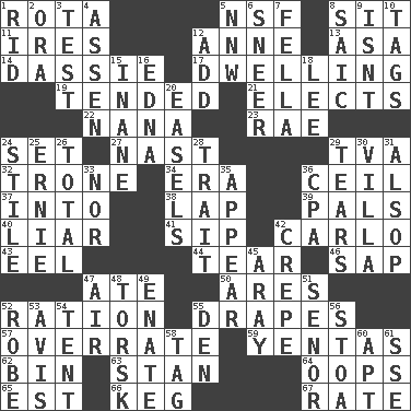 ACROSS 1. Round or rotation of duties 5. Science/research agcy. 8. Be seated 11. Angers 12. Queen of England 1702-14 13. White ___ sheet 14. Small ungulate mammals of Africa 17. Home 19. Looked after 21. Chooses 22. Nanny 23. Actress Charlotte 24. Put into a specified state 27. Political cartoonist Thomas 29. Federal power corp. 32. Heavy duty weighing machine 34. Epoch 36. To provide with a ceiling 37. To the inside or interior of 38. Infant locale 39. Friends 40. One who doesn't tell the truth 41. Small drink 42. Monte _, Las Vegas Hotel/Casino 43. Snakelike fish 44. Rend 46. Plant excrement 47. Had dinner 50. Ancient Greek god of war 52. Food allowance for one day 55. Window treatments 57. Make much ado about nothing 59. Gossips 62. Storage container 63. Comedian Laurel of Laurel & Hardy 64. I made a mistake 65. Eastern Standard Time (abbr.) 66. Cask 67. Assign a rank or rating to DOWN 1. To free from 2. Mouth or opening 3. Trial 4. NE Netherlands city 5. Compass dir. 6. Scornful expression 7. Chap (slang) 8. Ketch in the Levant 9. Is not 10. Labels 12. Find the sum of 15. Lacking in sense or substance 16. Pulitzer Prize-winning author Ferber 18. Area sheltered from the wind 20. Artist's stands 24. Vertical member of a panel or frame 25. Bert's buddy 26. Add up to 28. Distinguishing feature 29. Separates forcefully 30. Country estate 31. Columnist Joseph or Stewart 33. And not 35. Seem 36. Tax preparer (abbr.) 42. Streamer paper 45. Like ___ of sunshine 47. Wind 48. Cod relative 49. Maternal 51. Sir (Sp.) 52. Loose flowing garment 53. Opinion 54. Portable shelter 55. Lair 56. Portico 58. Label 60. Fitting 61. Compass dir.