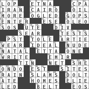 ACROSS 1. Trim (branches) 4. Inactive volcano in Sicily 8. Numbers guy (abbr.) 11. SW Asia republic 13. Capital of Egypt 15. Lubricate 16. Greater amount 17. Stared at amorously 18. Republicans 19. Keyboard key 21. Compass dir. 22. Butter sub 23. Mayday 24. Shoshoni 27. HTML Container Element 29. Burn superficially 30. Trials 34. Pacific Standard Time (abbr.) 36. Lacquered or enameled metalware 39. Nick name for Arthur 40. Put on (as clothing) 41. Standard of perfection 43. Naked 44. Relating to or accompanying birth 46. Singer James 47. Single 48. Compose 49. Arab leader 51. Shallow baking pan 53. Fish or hair follower 54. A female animal or person 57. Southwest Nigerian state 60. Eastern Standard Time (abbr.) 63. Locates 65. Precipitation 66. Shuts with force 69. Stupid person 70. Had dinner 71. Dwellings 72. Writer Wiesel 73. Directed 74. Waist strap 75. Greek goddess of the dawn DOWN 1. Citrus fruits 2. U. of Maine site 3. Actors' quests 4. Environmental prefix 5. Label 6. The longest river in the world 7. Ancient Greek god of war 8. Calm and collected 9. Corncob 10. In addition 12. Born 14. Wrote a lyric poem 18. State head 20. Regret 25. Jacques of French films 26. Wear away 28. Call ___ day 29. Ski resort town in Vermont 31. Surprise greatly 32. Periodic rise and fall of the sea level 33. Perceive with the eye 34. Lightbulb-shaped fruit 35. Suttee (variant) 37. Allow 38. Ingested 40. Compass dir. 42. Unable to walk 45. Luau accessory 50. ___ a Wonderful Life 52. Soft 54. Took without asking 55. Sun: prefix 56. _____ Park, CO 57. Spoken 58. Nathan's nickname 59. Passed on 61. Messy guy 62. Not wild 64. Binary compound 67. Cartoonist voice _ Blanc 68. Fast jet (abbr.)