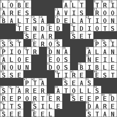 ACROSS 1. Ear part 5. The first octave above the treble staff 8. Three (prefix) 11. Ancient Greek god of war 12. Deliberation 13. Friend of Pooh 14. Greek mezzo-soprano Agnes 17. Conveyance 19. Looked after 21. Foolish or stupid persons 22. Burn superficially 23. Put into a specified state 24. Fast jet (abbr.) 27. Greek god of love 29. Air pressure measure (abbr.) 32. Peter (Polish) 34. Heredity factor (abbr.) 36. Actor Alda or Thicke 37. Medicinal plant 38. Greek goddess of the dawn 39. Famous astronaut Armstrong 40. Part of speech 41. Two (Sp.) 42. The Good Book 43. Compass dir. 44. Hoop that covers a wheel 46. Eastern Standard Time (abbr.) 47. Parent Teacher Assoc. 50. Oceans 52. A viewer who gazes fixedly 55. Ringlike coral islands and reefs 57. News announcer 59. Oozed 62. ___ a Wonderful Life 63. Drop; flow; fall 64. Have the gumption 65. Observe 66. Snakelike fish 67. Comedian Laurel of Laurel & Hardy DOWN 1. Experiment locale 2. Mouth or opening 3. Waist strap 4. _____ Park, CO 5. "___ Maria" 6. Ms. Damita and namesakes 7. Sadhe (variant) 8. Musical group of three 9. Carrot, for example 10. Charged atoms 12. Say or write further 15. Contemptuous expression 16. The sixth month of the Jewish calendar 18. Teat (slang) 20. Eaten away 24. Connects, as a bridge 25. Grain storage towers 26. Woman's close-fitting hat 28. Snout, nose 29. Military trainee 30. Travel by water 31. An arm off of a larger body of water 33. Nine, plus one 35. Aid 36. Cuckoo 42. Memphis, Tenn. Street 45. Vintage cars 47. Adept person 48. Laconic 49. Nick name for Arthur 51. Bobsleighs 52. Indian titles of respect 53. Wig 54. Domed church section 55. "We ___ not amused" (Victoria) 56. Argument over a trivial matter 58. Pipe bend 60. Epoch 61. Lair