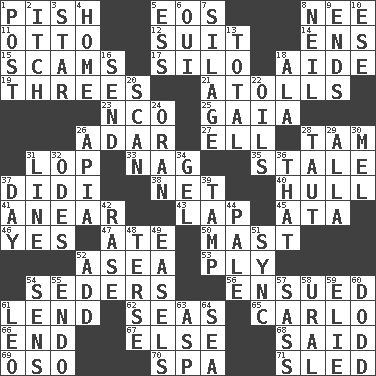 ACROSS 1. Expression of disdain 5. Greek goddess of the dawn 8. Born 11. Von Bismarck 12. Set or collection 14. Followers of ems 15. Fraudulent business schemes 17. Grain storage tower 18. Helper 19. Triplets 21. Ringlike coral islands and reefs 23. Non-commissioned officer (abbr.) 25. Greek goddess of the earth (variant) 26. The sixth month of the Jewish calendar 27. Pipe bend 28. Scottish cap 31. Chop off 33. Tired old horse 35. Having lost freshness 37. "You Light Up My Life" star Conn 38. Fish or hair follower 40. Frame or body of a ship 41. Approach 43. Infant locale 45. "One Day ___ Time" 46. Affirmative reply 47. Had dinner 50. Vertical spar for supporting sails 52. At sea 53. Strand of rope, yarn or thread 54. Spring feasts 56. Took place subsequently 61. Grant temporary use of 62. Oceans 65. Monte _, Las Vegas Hotel/Casino 66. Conclude 67. Otherwise 68. Expressed in words 69. Bear (Spanish) 70. Health resort 71. Downhill vehicle DOWN 1. Mail 2. Hankering 3. Play the lead 4. Dwelling 5. Double-curved letter 6. Fr. "Yes" 7. Fodder prepared in a silo 8. Famous astronaut Armstrong 9. Extremities 10. Compass dir. 13. "_____ Recall" 16. Post 18. In the manner of 20. Glance over 22. Petroleums 24. NW Algerian seaport 26. Capital of Western Samoa 28. Drawn tight 29. Silent film actress Nazimova 30. Cartoonist voice _ Blanc 31. Actor's bit 32. Lyric poems 34. Set 36. Not this but _ 37. 24 hours 39. Pack (down) 42. Raze (variant) 44. Light colored 48. Laconic 49. Artist's stands 51. Synchronize (abbr.) 52. Find the sum of 54. Elected reps. 55. Inside; within (prefix) 57. Backtalk 58. Mountain range 59. Writer Wiesel 60. Texas town _ City 61. Lion 63. Cleo's killer 64. Ocean